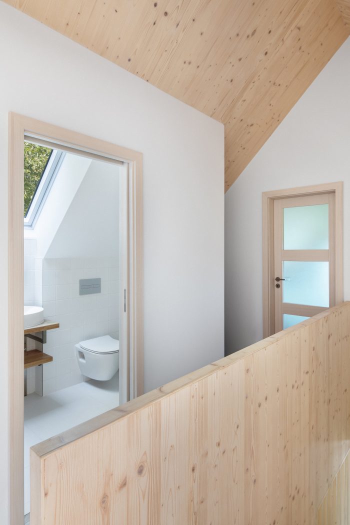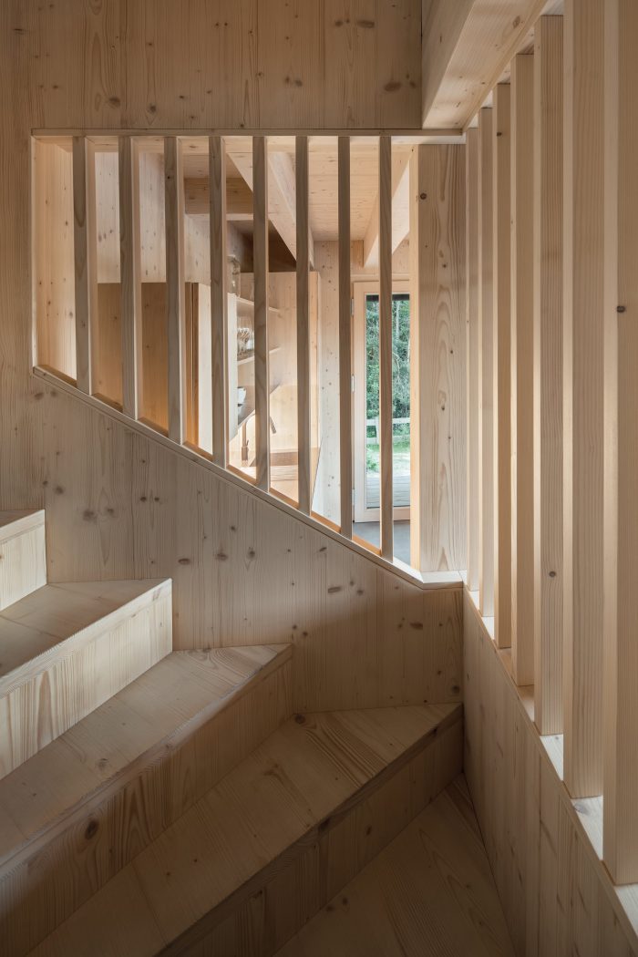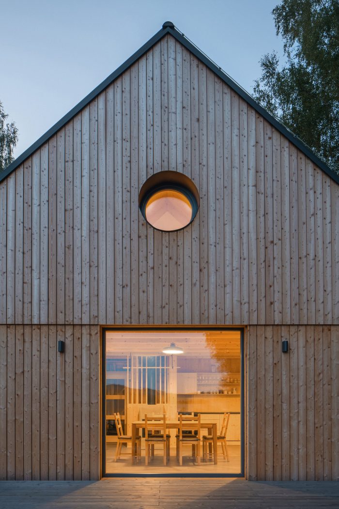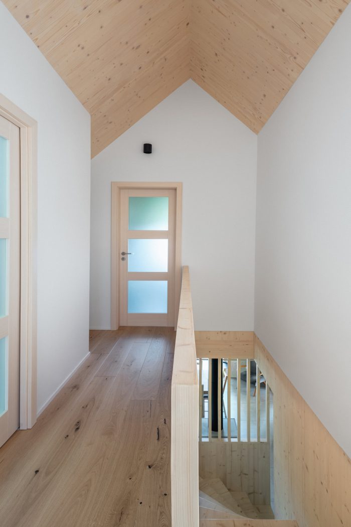 The building is designed as a wooden structure made of CLT panels visible in the interior. The cladding of the facade consists of vertical larch profiles, the windows are complemented by integrated sliding shutters, and the roof is sheet metal. The building was realized by a family company 3AE which worked in close collaboration with the author. Besides the final quality of the building, they also ensured a high level of detailed execution. Shared values, a sense of detail, and an appreciation of natural materials make the final result resonate.