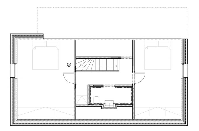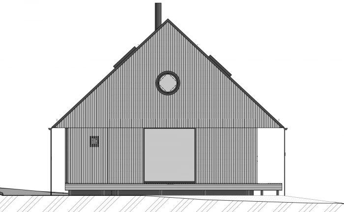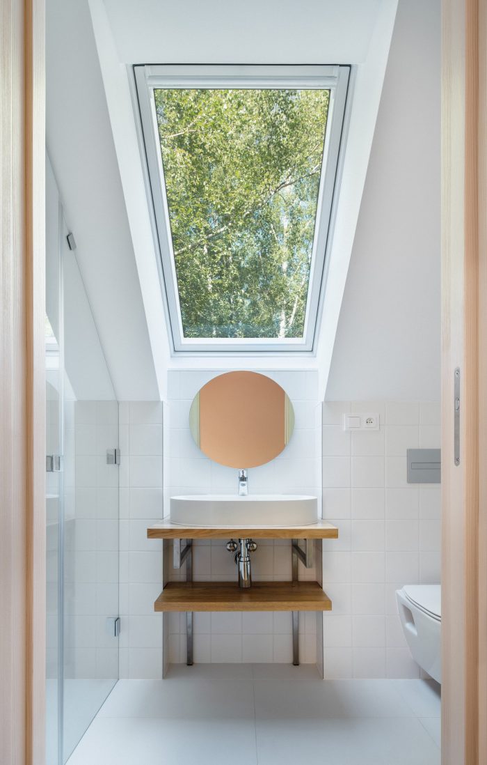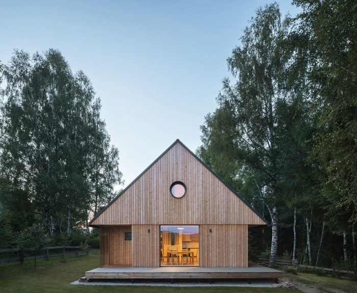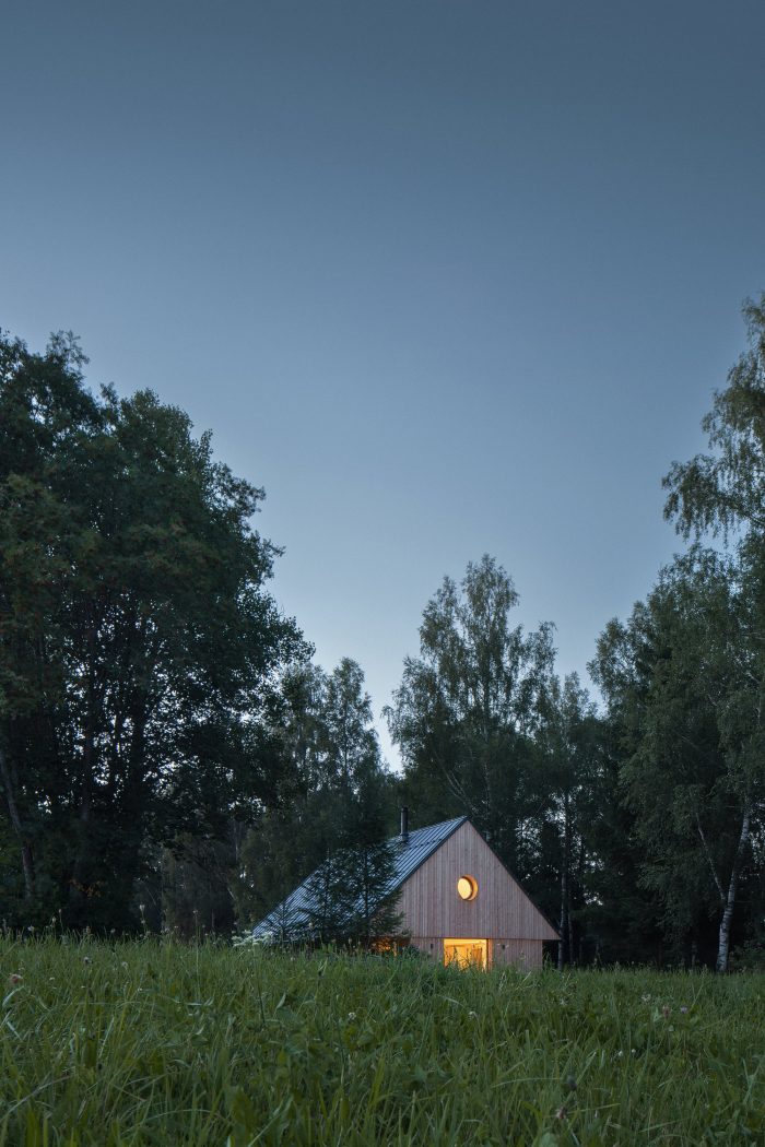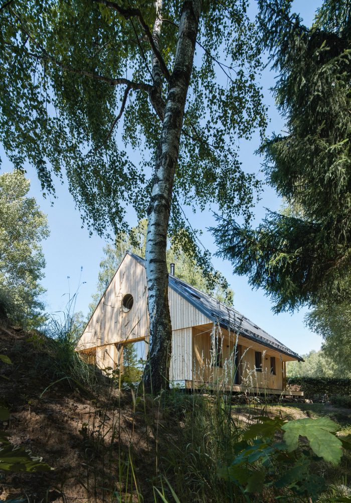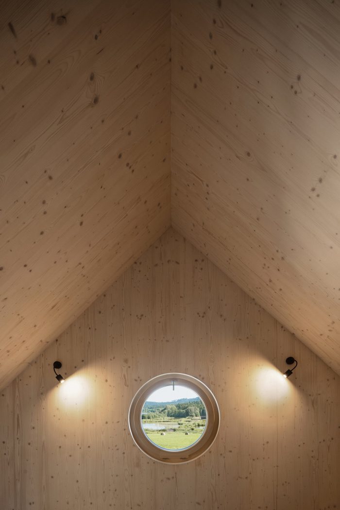The view of Lipno lake, with two major peaks in the background, becomes the main point of the project. The living space of the house is centered around the dominant gabled square window facing toward the lake. The other windows have a direct view of the forest. The forest is present in the interior as a material, smell, and color. One small room, a bathroom, a laundry room, a small sauna, and a room for storing sports and technical equipment are located on the ground floor. The attic hides a bathroom, a pantry, and two bedrooms with a circular window in the gable, framing other peaks in the area.