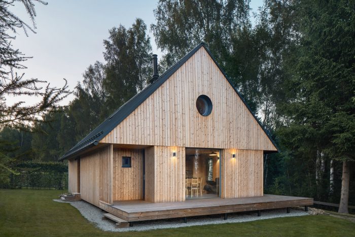 房屋的形态符合波西米亚森林建筑的几个原则:长方形的平面图,紧凑的形状,沿着等高线的方向,创建一个有盖的门廊,以及更明显的屋檐衔接(悬空)。该建筑为单层,有一个阁楼。檐口平面与门窗的门楣在一条水平线上的高度一致,是对檐口的一种现代诠释。