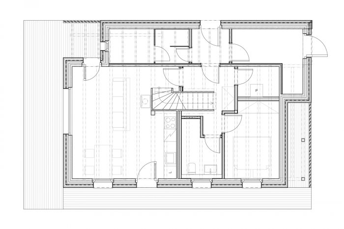 Three sides of the house are lined by a wooden terrace, which, depending on its variable width, creates, together with a significant overhang of the roof, a space for various uses (sitting in the sun and in the shade, a sauna rest room, storage of wood and bicycles).