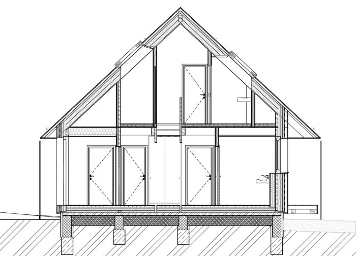 The morphology of the house stands on several principles of Bohemian Forest architecture: rectangular floor plan, compact shape, orientation along the contour line, creation of a covered porch, and more pronounced articulation of the gable (overhang). The building is a single-story with an attic. The height alignment of the eaves plane with the lintel of the windows and doors on one horizontal line is a contemporary interpretation of the cornice.