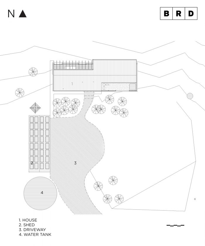 这个项目的核心驱动理念是让我们的客户与他们的场地和周围环境相连。因此,住宅并不优先于周围的环境,而是与现有的农业基础设施形成一种同源关系。这一点是通过简单的屋檐形状的形式构成来实现的,并通过提取元素来创造户外生活的开孔。材料的选择考虑了当地的可用性、丛林防火、遮阳、维护和光泽度。