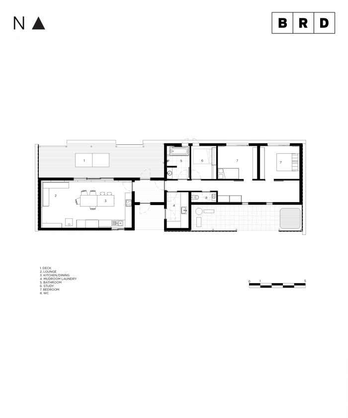 该住宅被安排成两个主要区域,使家庭生活相互联系,但也有隐私和庇护。大厨房延伸到一个巨大的遮阳甲板上,提供了娱乐的机会,而厨房岛/餐桌将厨房、餐厅和甲板区域连接起来,成为家庭活动的焦点。在住宅的另一端坐落着宽敞的卧室,每间卧室都有充足的存储空间,自然光和微风,为休息和放松提供了一个宁静的退路。卧室蔓延到一个超大的走廊上,为不断增长的家庭提供进一步的存储和游戏空间。