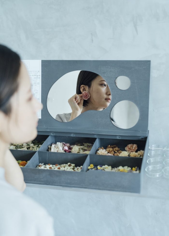 Parts. The wall on the side of Sorayasu Inou Shrine is lined with four iron boxes bearing the names of the seasons. The panels that block the existing openings are randomly placed with round holes so that light can penetrate through them and convey the world of the shrine as much as possible. When the lid of the box is opened, the flowers inside are classified in detail by type, and labels with the name of the variety and the language of the flowers are pasted on them. Even among the same type of flower, the shapes and colors of the forms created by nature vary widely when compared one by one. Here, visitors can choose flowers, leaves, and berries that match their skin color and frame, and select accessory parts such as earrings and necklaces to create one-of-a-kind accessories that are uniquely created for them.
