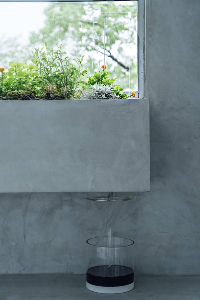 Farm. A flowerbed was placed inside the gallery to match the existing large opening overlooking the old Ota River, creating the impression that the green landscape of the riverbank was bleeding into the gallery. To prevent the roots from rotting, the discarded water from the flower beds is caught by a glass funnel and a container, and by holding in the space what would normally flow and disappear, I hoped to convey the richness of the earth's life force in the brown liquid, like coffee. The flower beds are periodically replanted according to season and seasonality. The materials grown in this space will be used for future works of art, and the work is full of possibilities for the future.