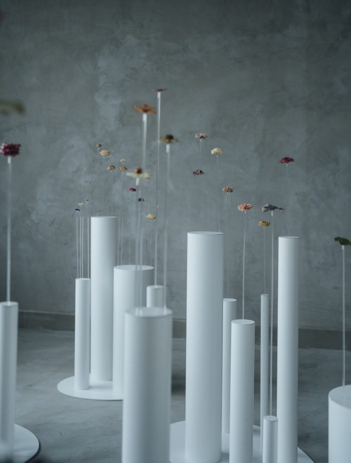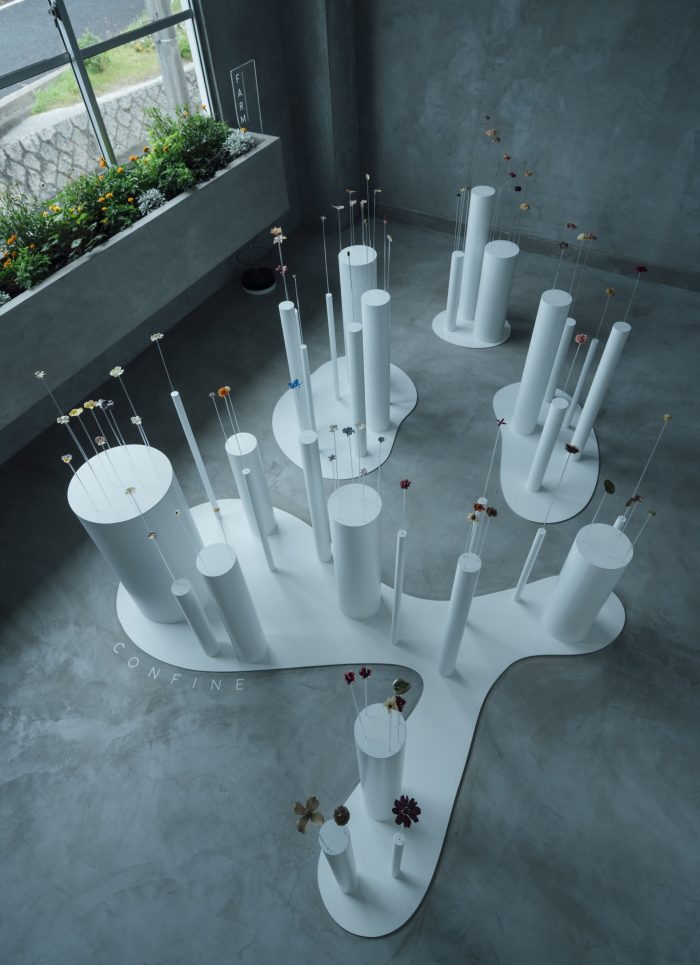 The four themes are: 1. Growing materials [FARM] 2. Encapsulating materials with acrylics [CONFINE] 3. Selecting flowers/leaves/fruits and metals (accessory parts) that suit your body [PARTS]. 4. The two are joined together in the studio to form the work [FIXED]. The design was based on the double structure of creating the overall space while creating the vase as an architectural device based on each theme that would not be defeated by the strength of the work, and although it was a small space of fewer than 10 tsubos, it ended up being a project that took a considerable amount of time.