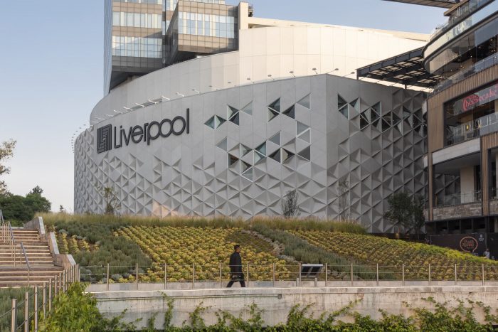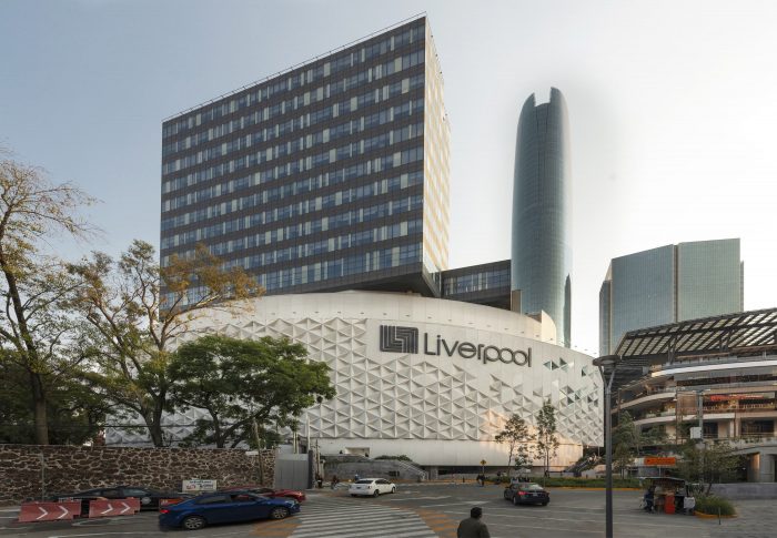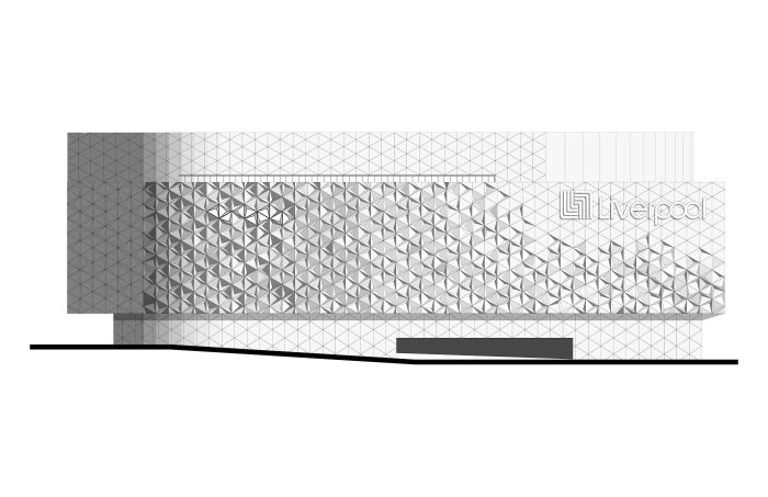 The design intention of this façade is to confirm the basic module as part of the graphic recognition of the brand. This is the fourth façade designed for Liverpool within the Mexican Republic, an exercise that integrates figures by means of solar illumination and the generation of games of shadows and reflections. The scale in this project is much more urban, there is no direct connection with the user since there is no pedestrian circulation that can be referred to from the street. This is an almost floating façade, from the second to the fifth level.