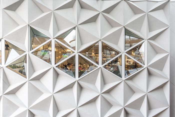 The construction of the façade is made from precast white concrete on metal frames. This material requires minimal maintenance and, as it is a designed piece, it allows the least number of adjustments in placement.