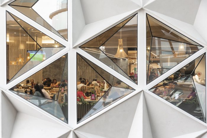 The façade converges on the curve that marks the end of "Mayorazgo" street, where the garden-plaza is located at the back of the property. The façade is segmented into several interior and exterior planes and volumes, formed by a grid of triangular modules with flat and low-relief pieces, which create a subtracted pyramid. By rotating this pyramid, multiple variables can be obtained, managing to convey a sensation of movement. The texture rotates along the curved wall and is presented in a flatter and more cut way in the interior segments, but clearly identified as a complement to the design language. As part of the design and the game of reliefs, the same geometry is subtracted by means of windows that frame some high points, allowing natural lighting inside and showing the use of space from the outside.