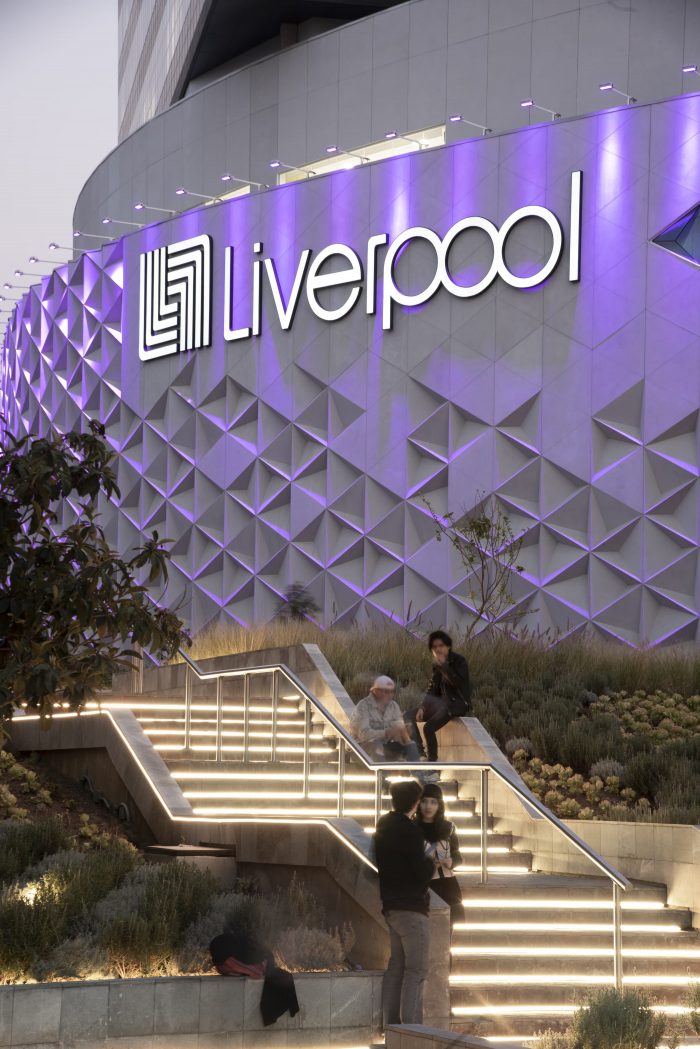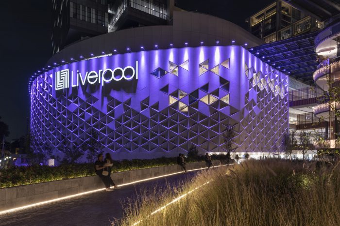 这个立面的设计意图是确认作为品牌图形识别一部分的基本模块。这是为利物浦设计的墨西哥共和国境内的第四个建筑立面,通过太阳能照明以及阴影和反射游戏,将数字融入其中。这个项目的规模更加城市化,与用户没有直接联系,因为没有可以从街道上看到的人行通道。从第二层到第五层,这几乎是一个漂浮的立面。