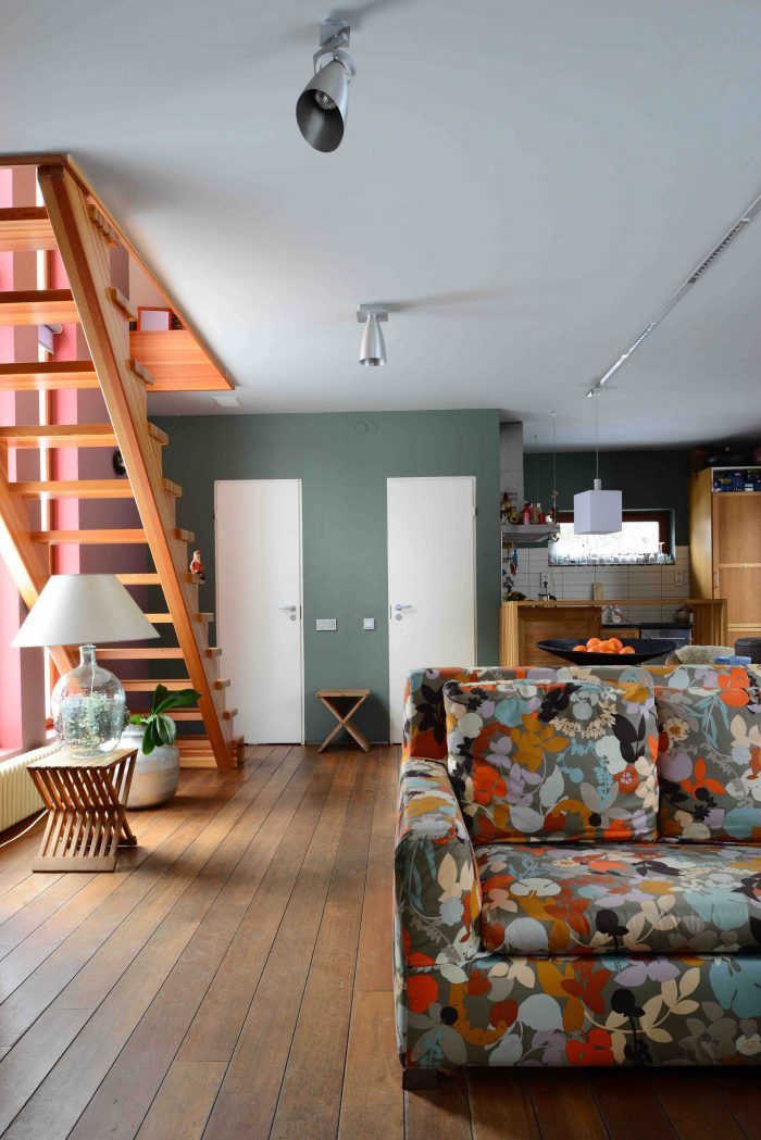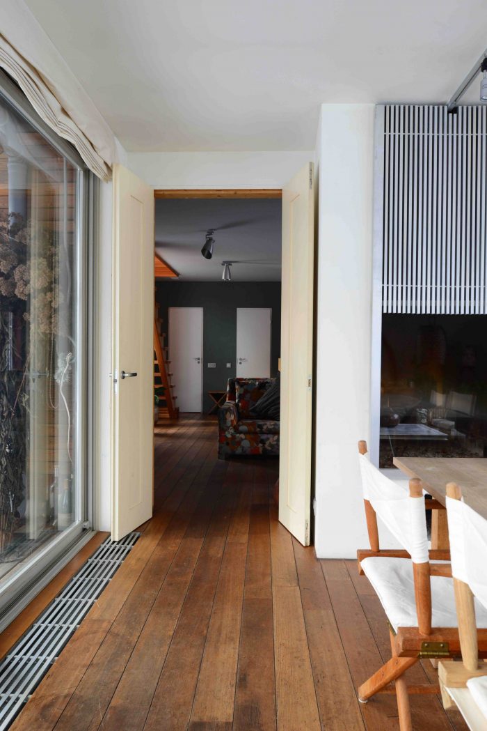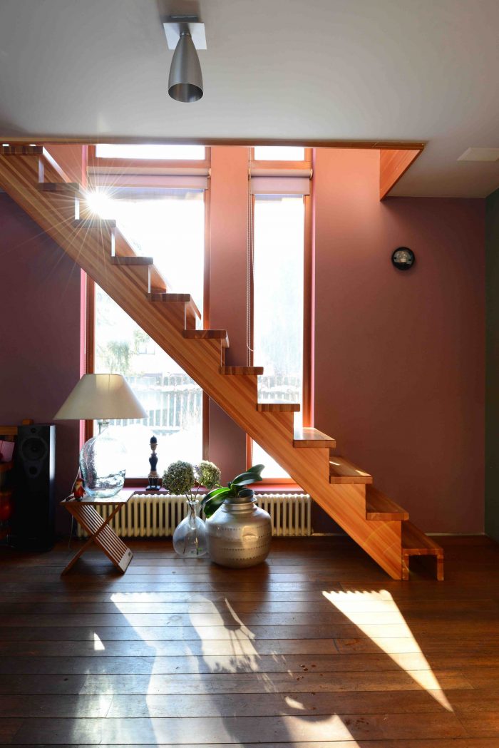 On the 2d level there are bed-rooms, a bathroom and an open solarium. A curved-glass roof brightens the space, bringing more daylight into the rooms of the upper floor.