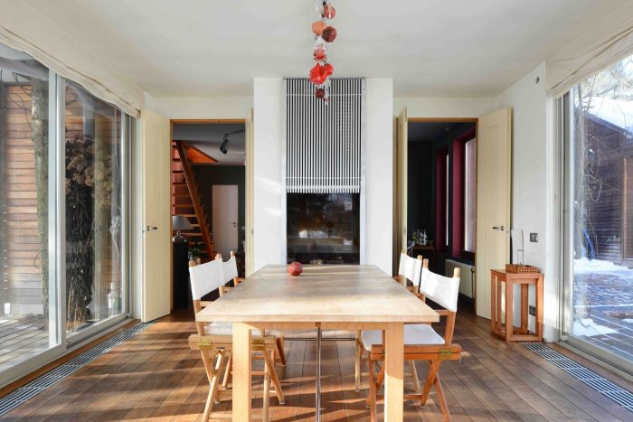 在两层房屋的底层,有一个公共空间,有露台-客厅-餐厅-厨房和一个双面玻璃壁炉。公共区域由玻璃推拉墙包围,可以俯瞰地块周围的景观。