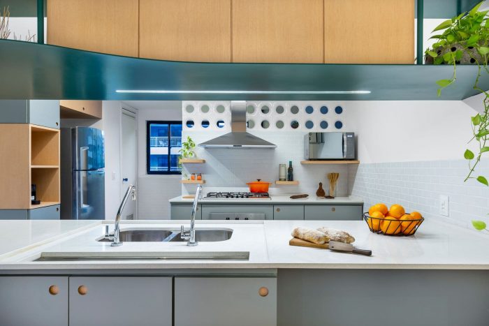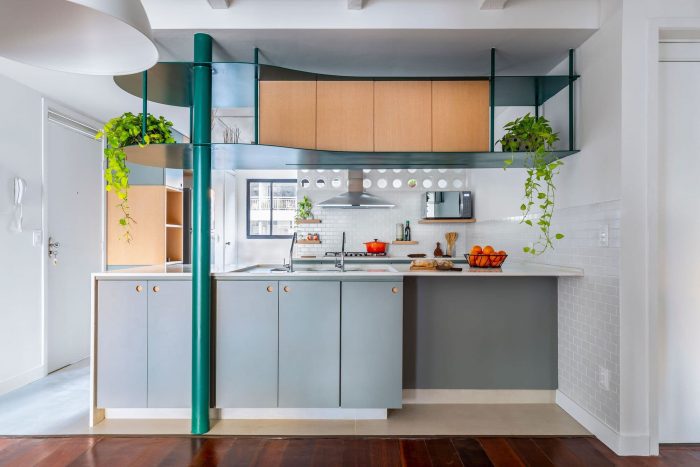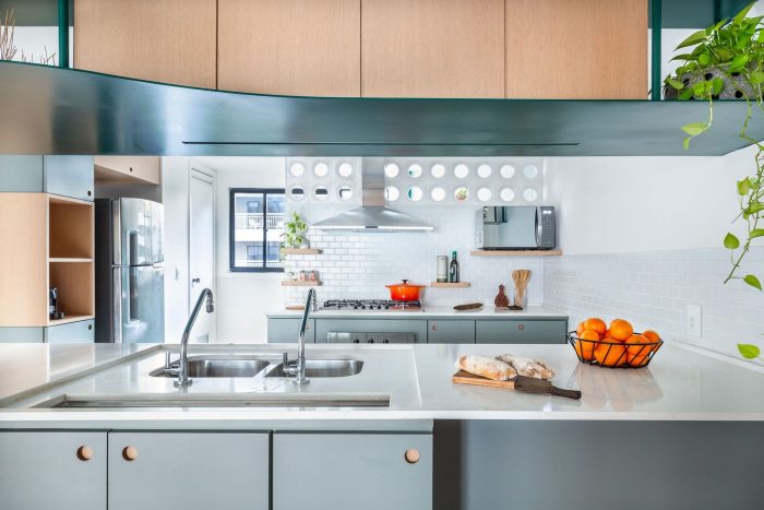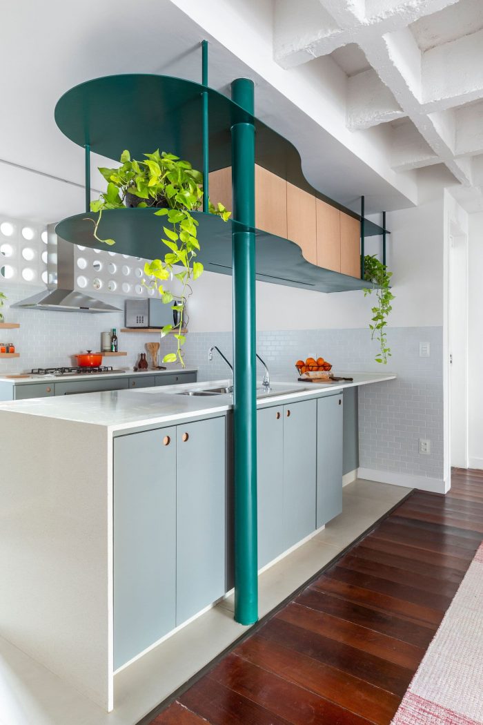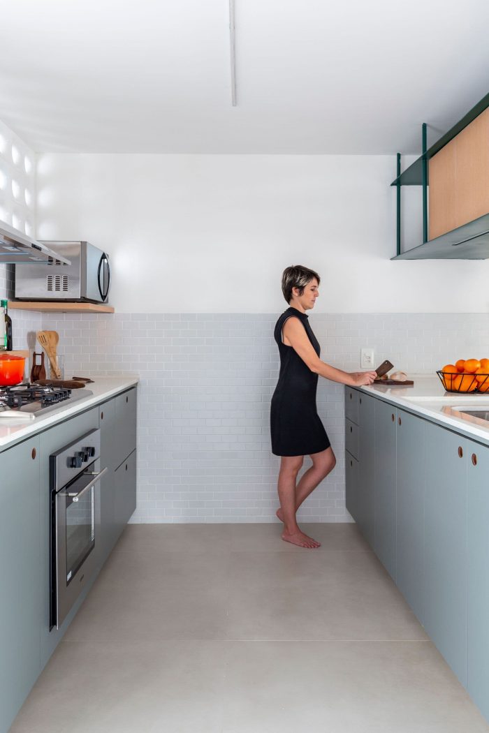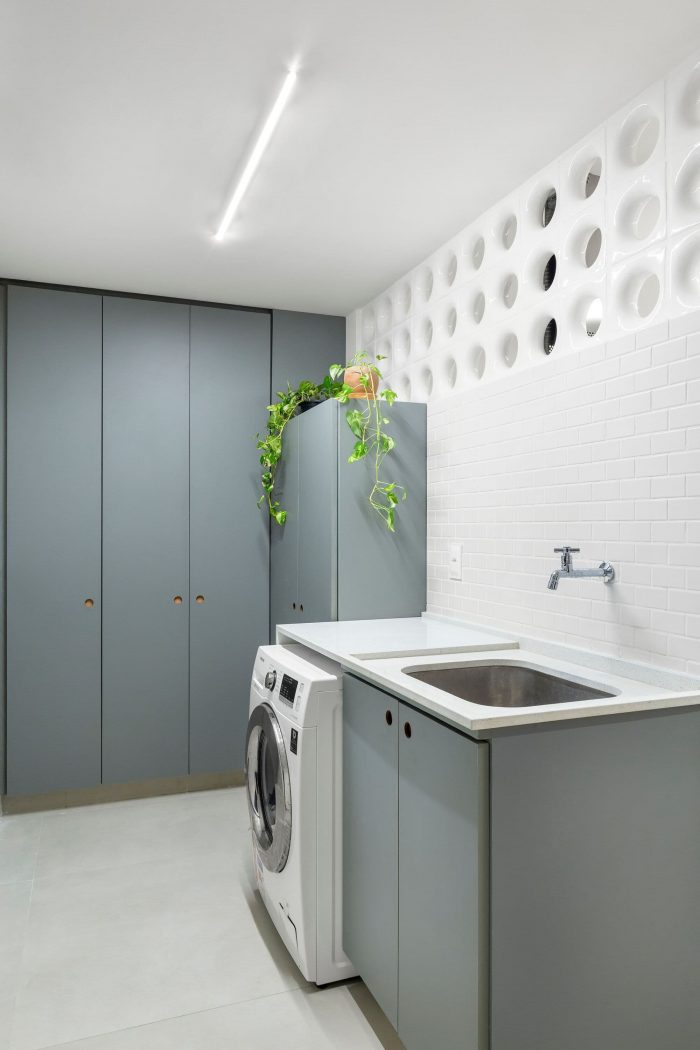 The laundry area and kitchen were separated by a cobogó wall ensuring ventilation and lighting. The service area and the kitchen were separated by a Silestone countertop and a carbon steel shelving unit fixed to the slab.