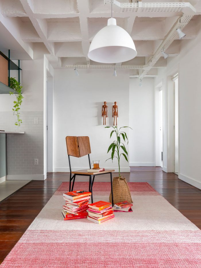 Still considering the project’s environmental comfort, the choice was to remove the ceiling in the living room to increase the ceiling height. Thus, leaving the waffle slabs apparent and white.