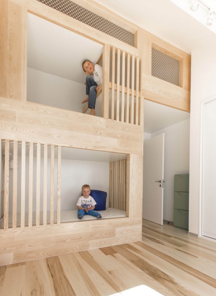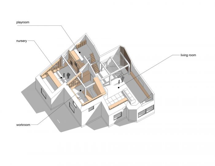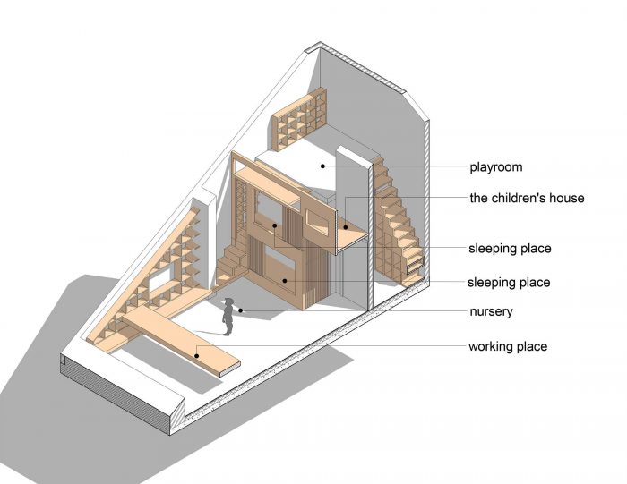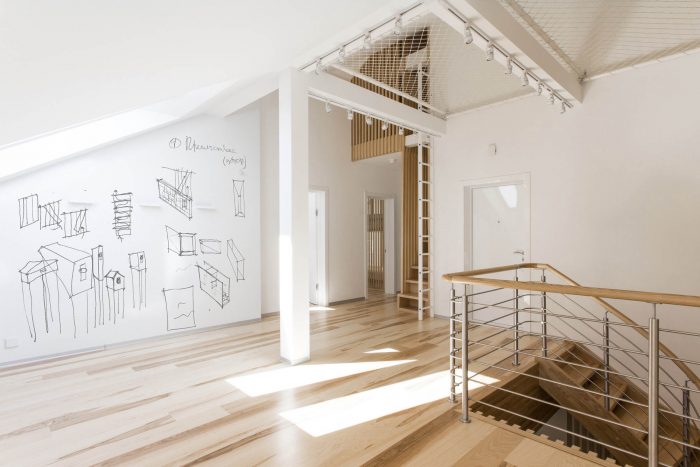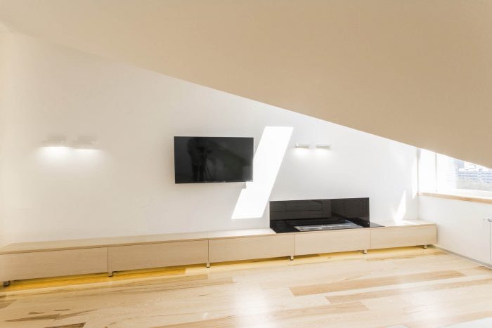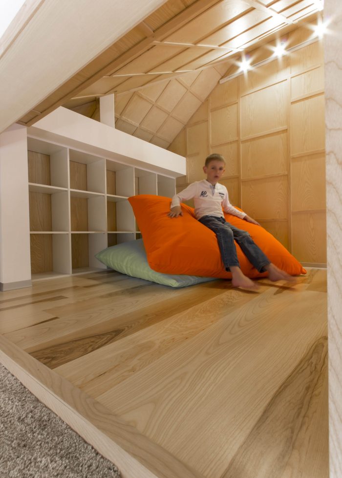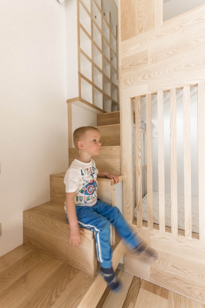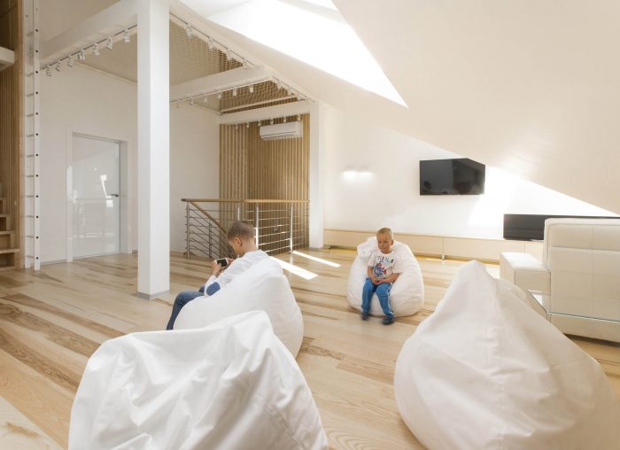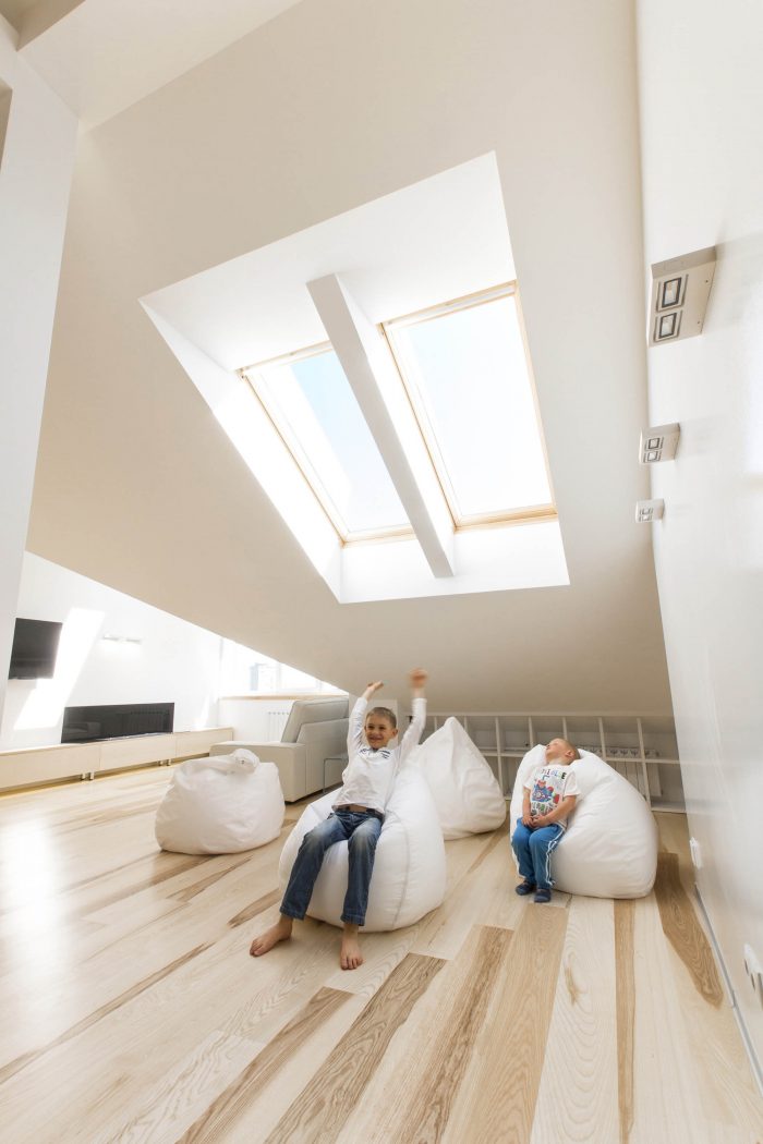 Top-floor apartment with an attic. Our task was to turn an uninhabitable attic into a comfortable and bright loft. Requirements of the customer - a feeling of light and space, functional furniture, attractive playrooms, ample storage space. The result: the loft apartment with maximum functionality and comfort, minimum decor.