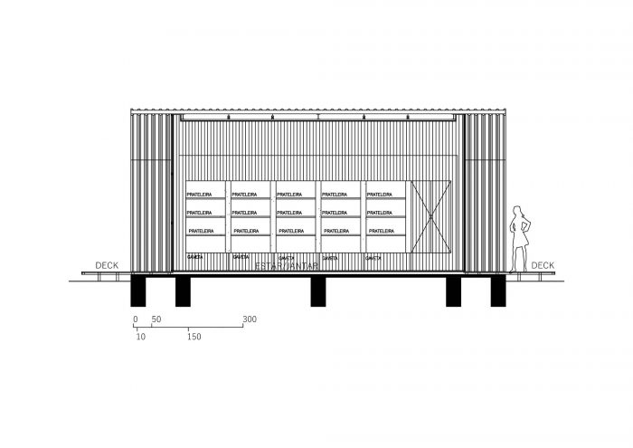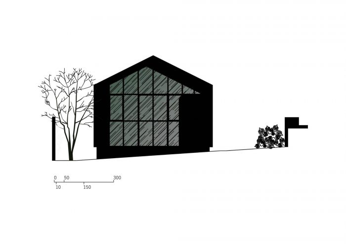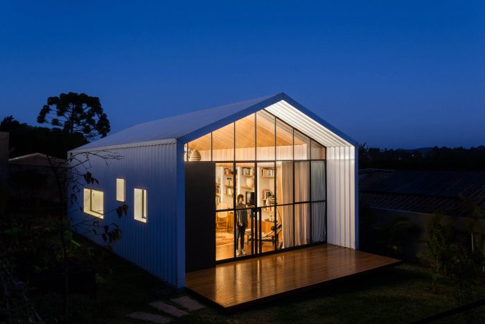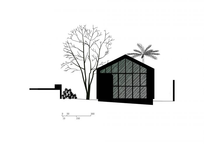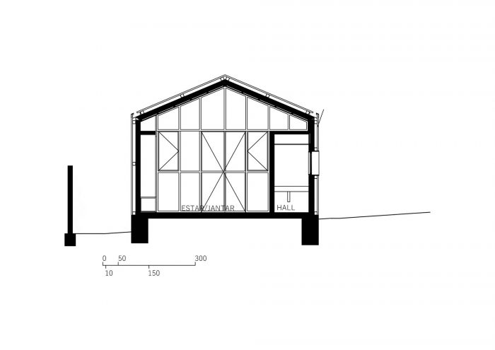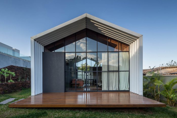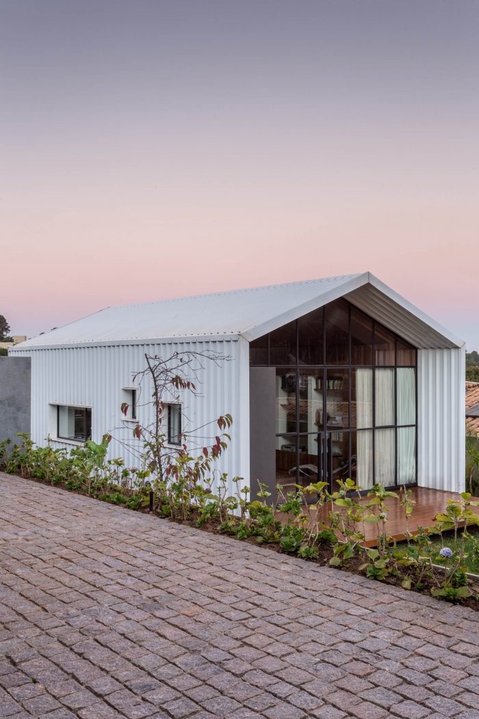 The building was located at the back of the site, close to neighboring buildings and at a level well below the main house, which created an image of overlapping roofs. This led to the idea of recreating the original typology of a house with a gabled roof, but in this case, entirely covered with white metallic tiles, which was also a material used on the roof of the main house.
