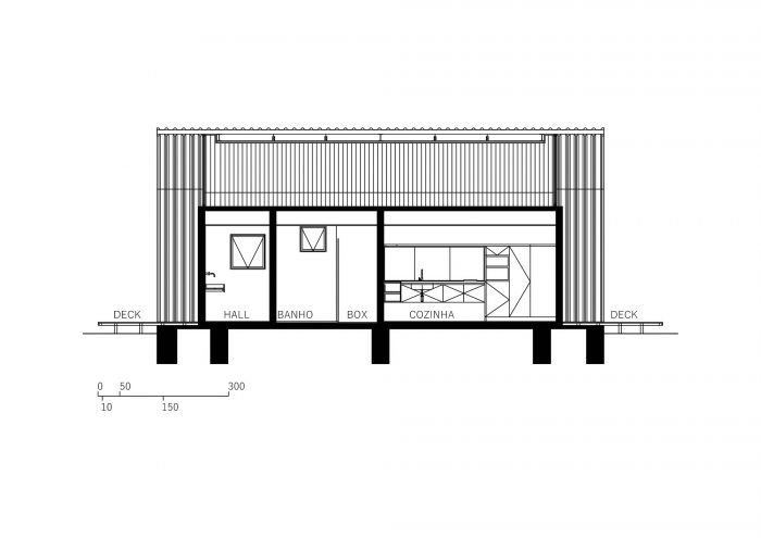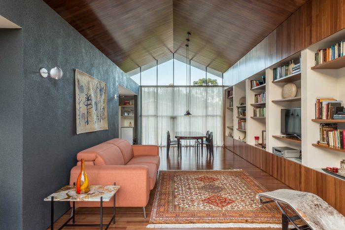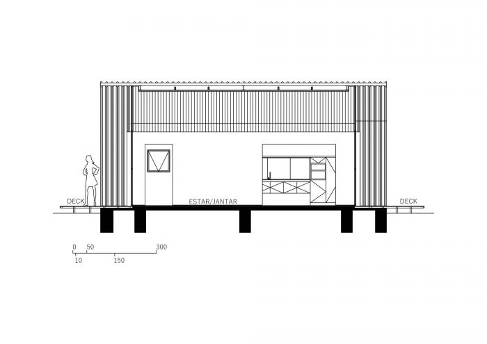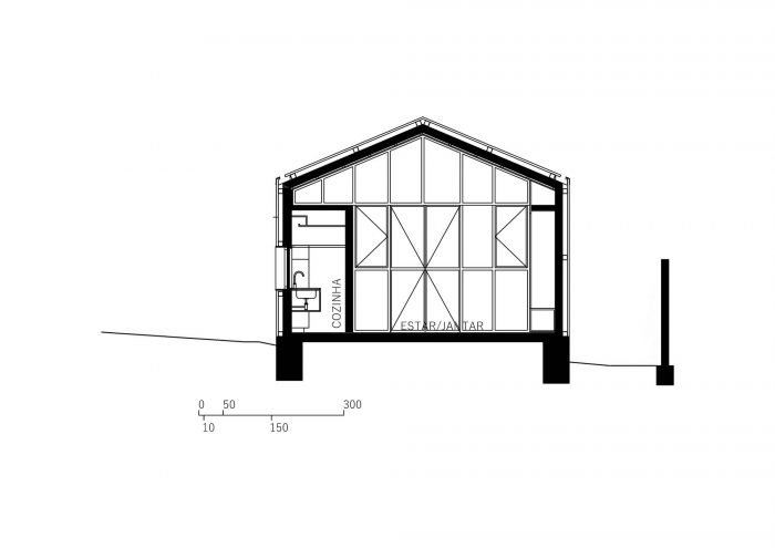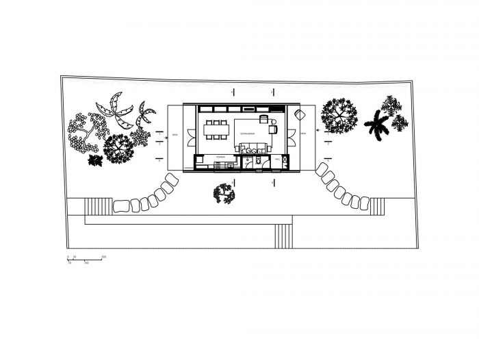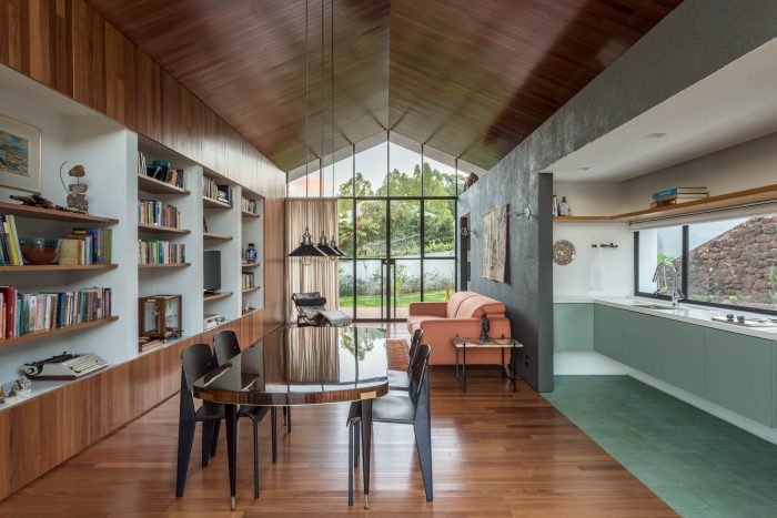 Unlike the main house, where the main openings face north and south, in this annex, the glazed openings face east and west, and the facades covered with tile, face to the main house and the neighboring house, providing greater privacy for all.