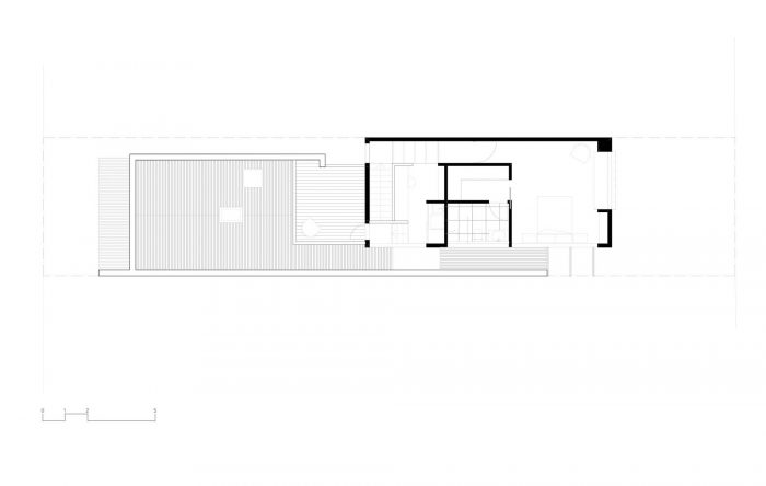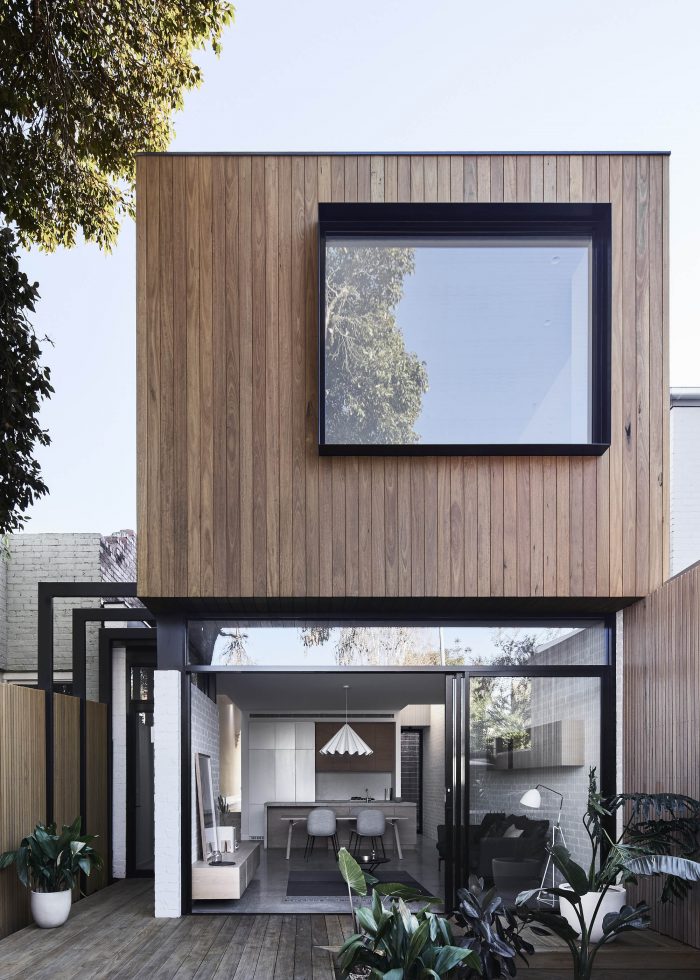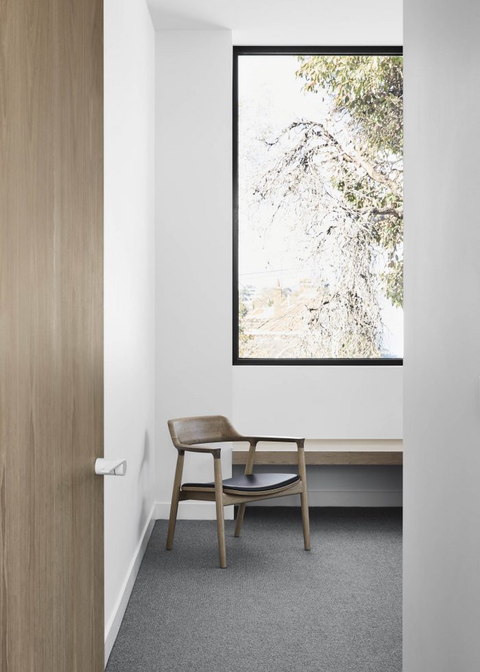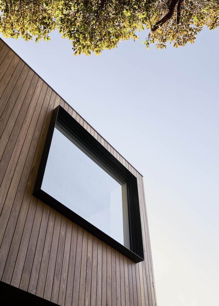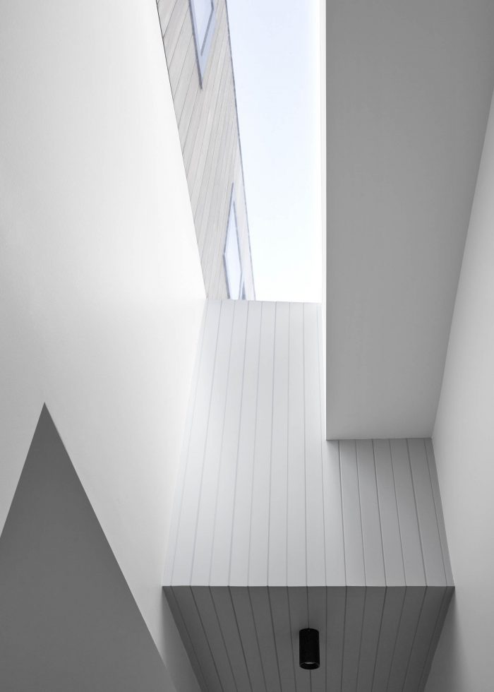 Strategically placed windows open the home to the courtyard and garden. In the living area, glass forms an elegant separation between the ceiling planes and internal walls, creating a sense of lightness and space.