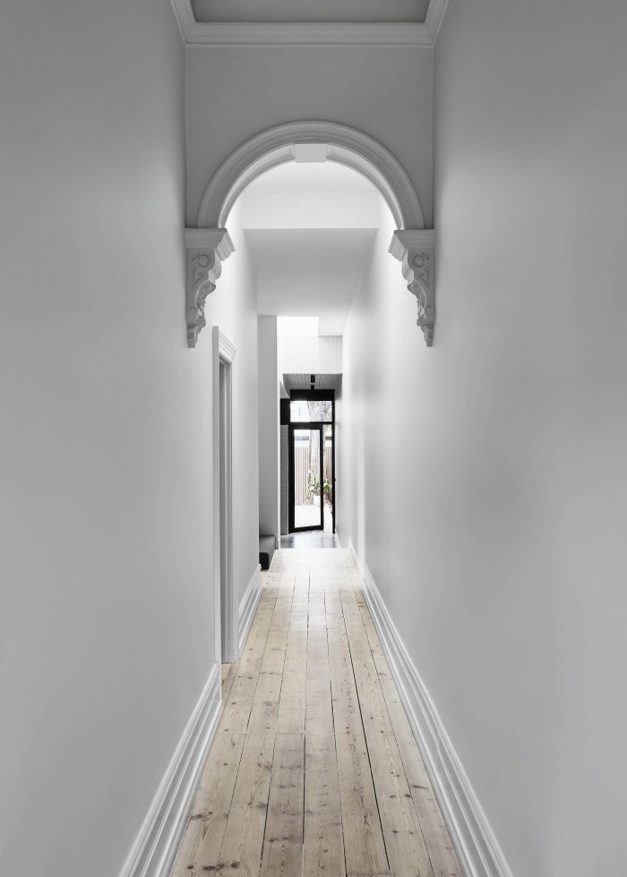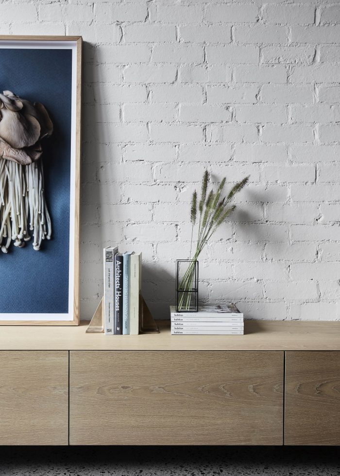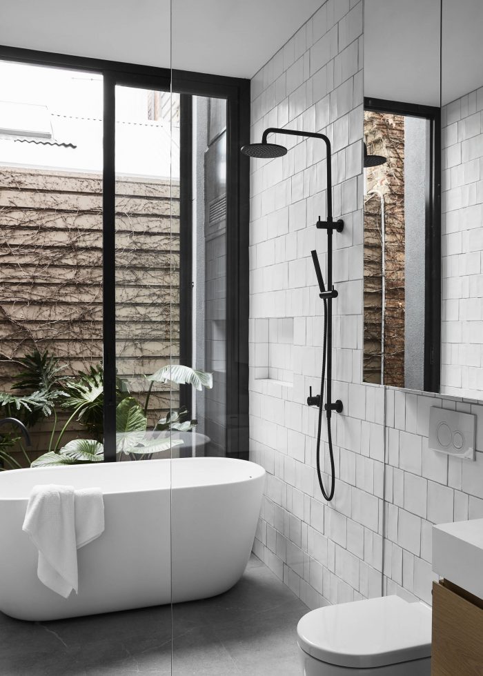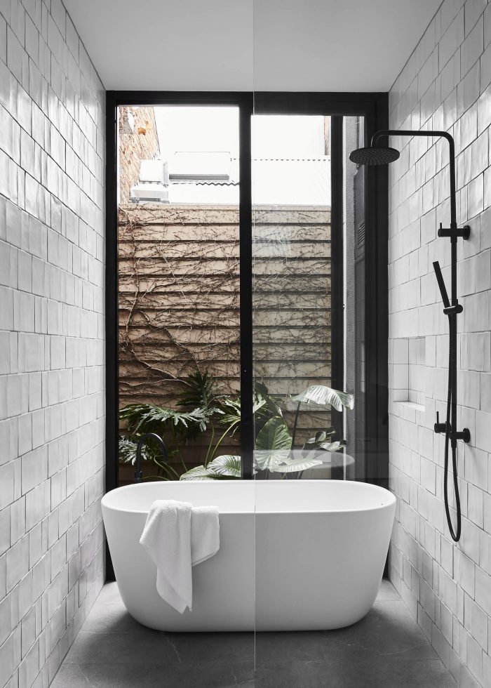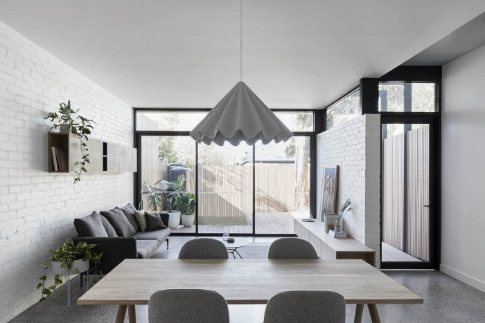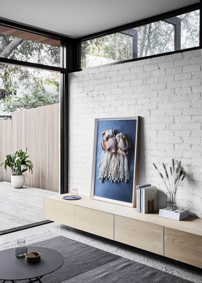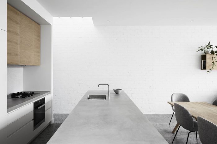 Refined material and colour palettes subtly reference the home’s heritage origins while maintaining a clean minimalist interior. Internal brick walls are painted white in continuity with the monochrome colour palette and recall the brick walls of traditional cottages. In the bathroom, the texture of the white tiling is again reminiscent of brick, contributing a contemporary take on traditional materials.