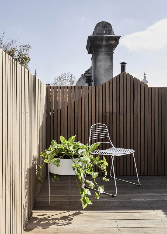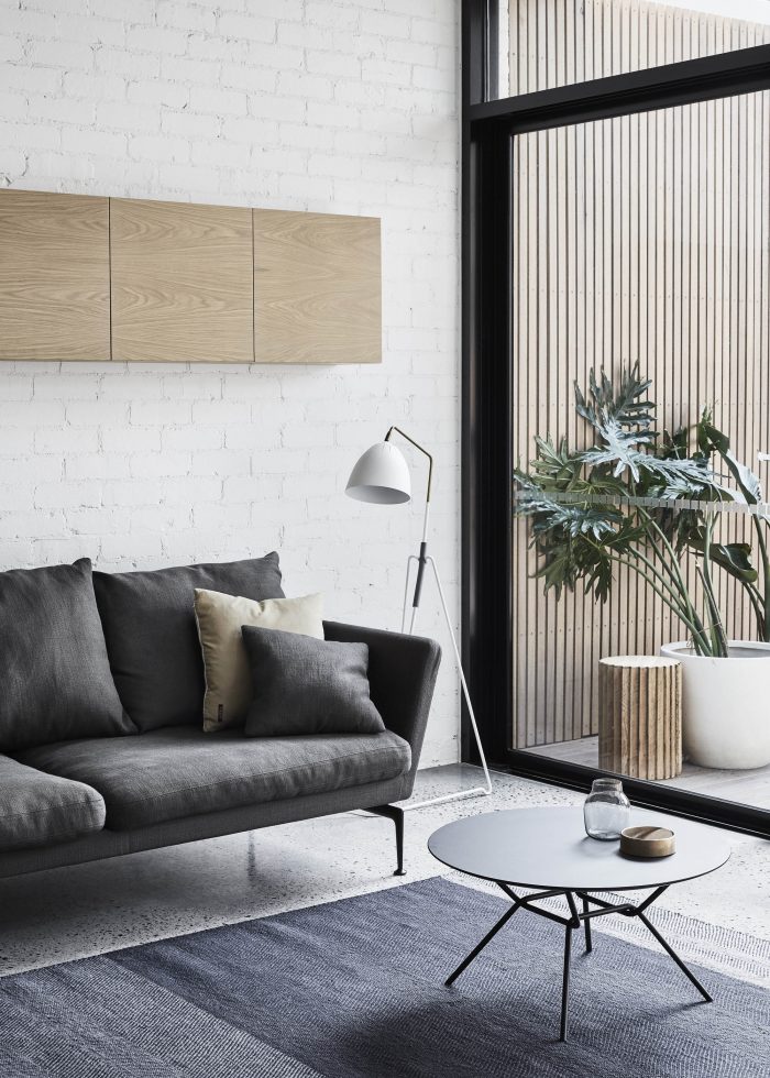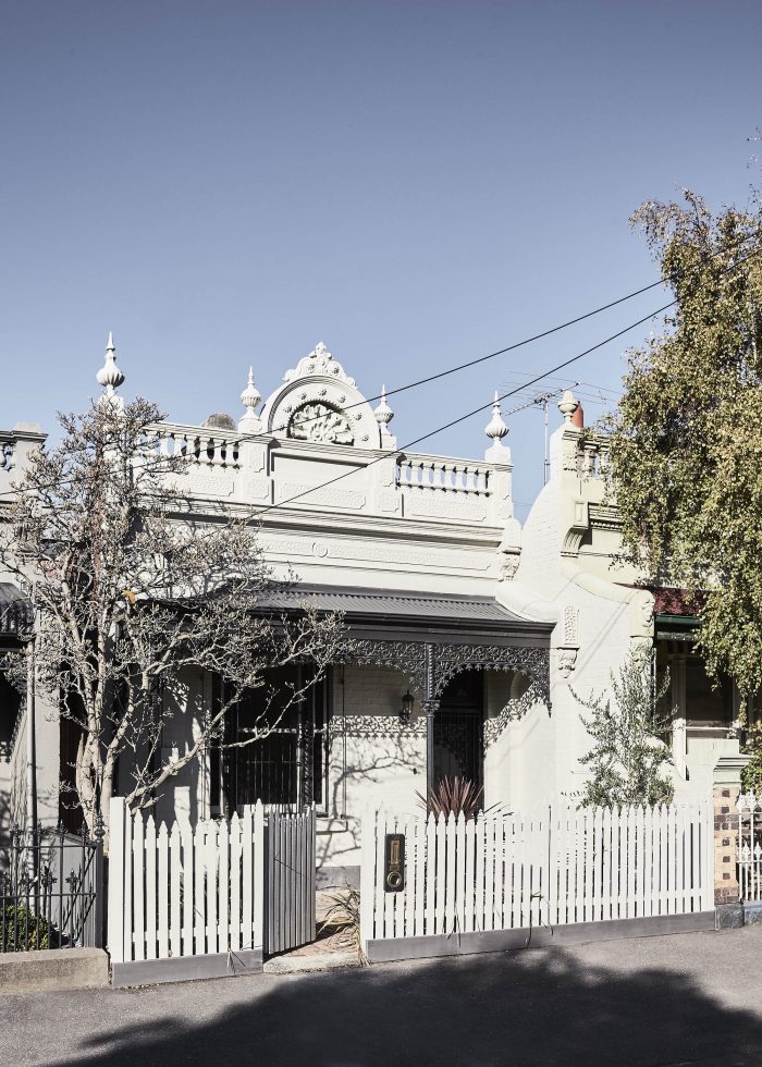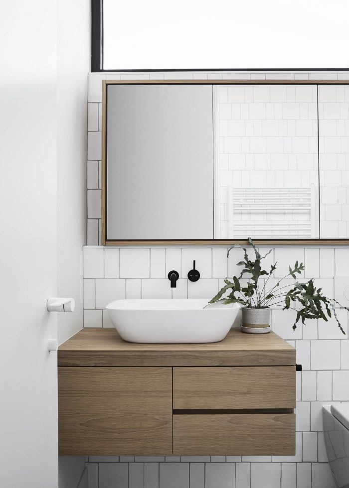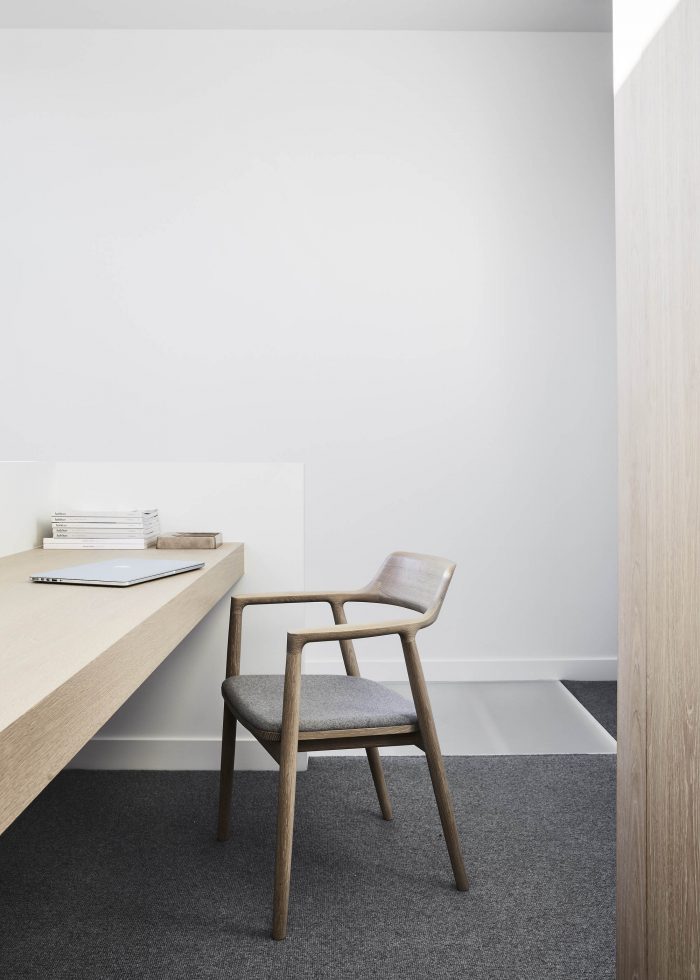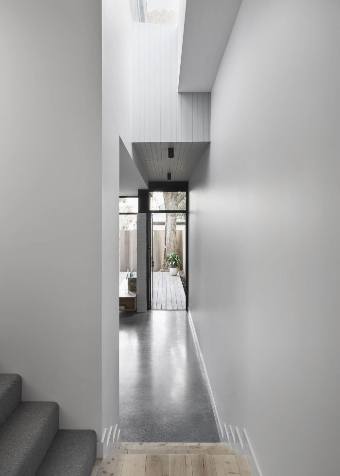 Refined material and colour palettes subtly reference the home’s heritage origins while maintaining a clean minimalist interior. Internal brick walls are painted white in continuity with the monochrome colour palette and recall the brick walls of traditional cottages. In the bathroom, the texture of the white tiling is again reminiscent of brick, contributing a contemporary take on traditional materials.