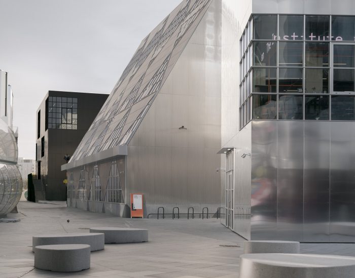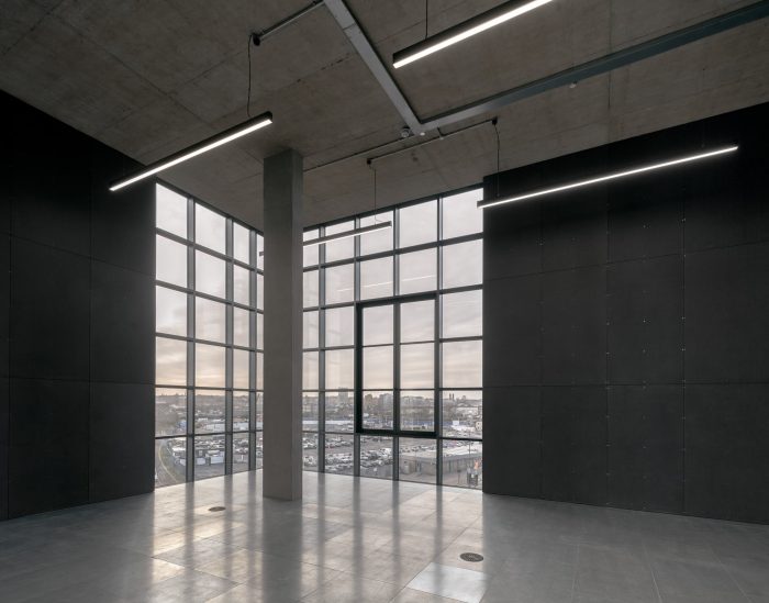 The Design District on the Greenwich Peninsula is a one-hectare riverside site with 16 new buildings that will provide an affordable base for creative businesses to trade, interact and grow. Eight emerging architectural practices from across Europe were each given a pair of buildings and asked to work blind, without knowing what the others were designed. The result is a provocative diversity of color and form in a new neighbourhood devoted to design, art, tech, craft, and music. In this kind of undefined and evolving context, devoid of urban references, the project defines two very pragmatic buildings – industrial containers that maximize the flexibility of the interior and explore the use of basic construction systems. The project plays with the imagination of an artist’s studio, emphasizing the use of light in a workspace defined by large windows, double-height rooms, and certain raw materiality.