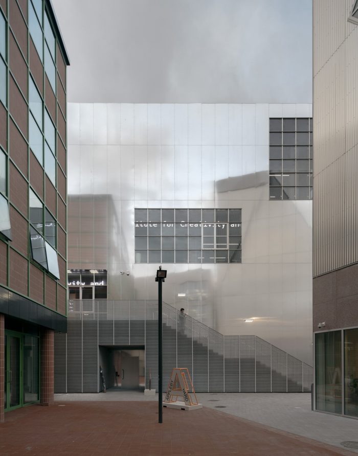 反射的材料性将建筑溶入到未来的环境中,并使它们参与到街区的生活中,吸收和反射周围环境的光线和颜色,因为它们随着一天的时间和季节的变化而变化。