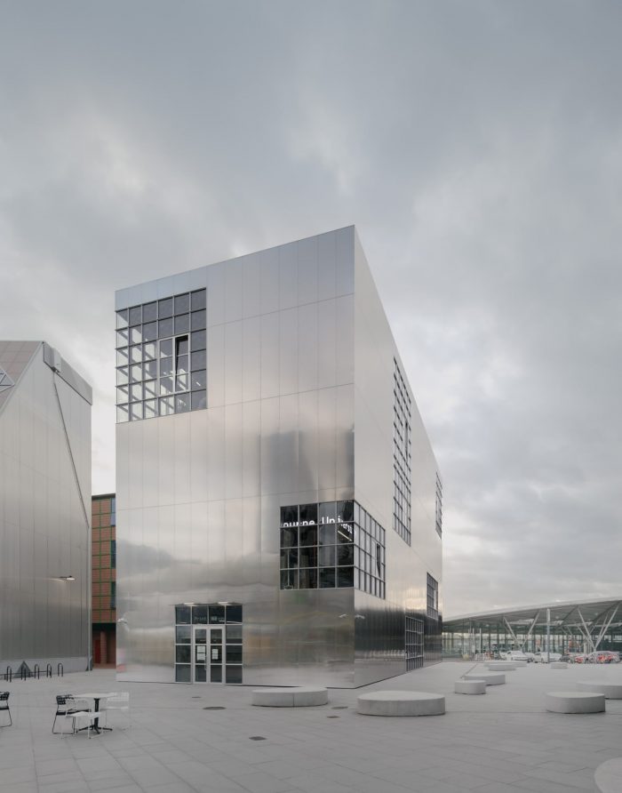 The reflective materiality dissolves the buildings into the future context and makes them participate in the life of the neighbourhood, absorbing and reflecting the light and colours of the surrounding environment as they change with the passage of the day and the seasons.