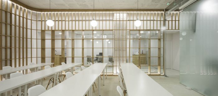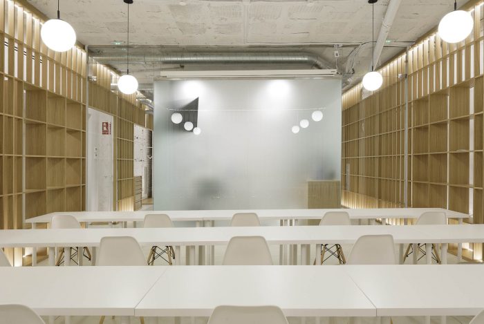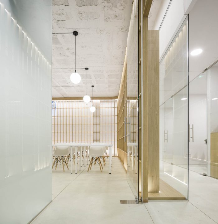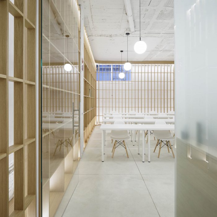 On the other hand, a frosted glass box in the center of the space houses the three patient rooms, while also separating the access area from the classroom. This pristine volume stands freely without reaching the ceiling. Its translucent skin allows for natural light to go through, while providing privacy to the patients.