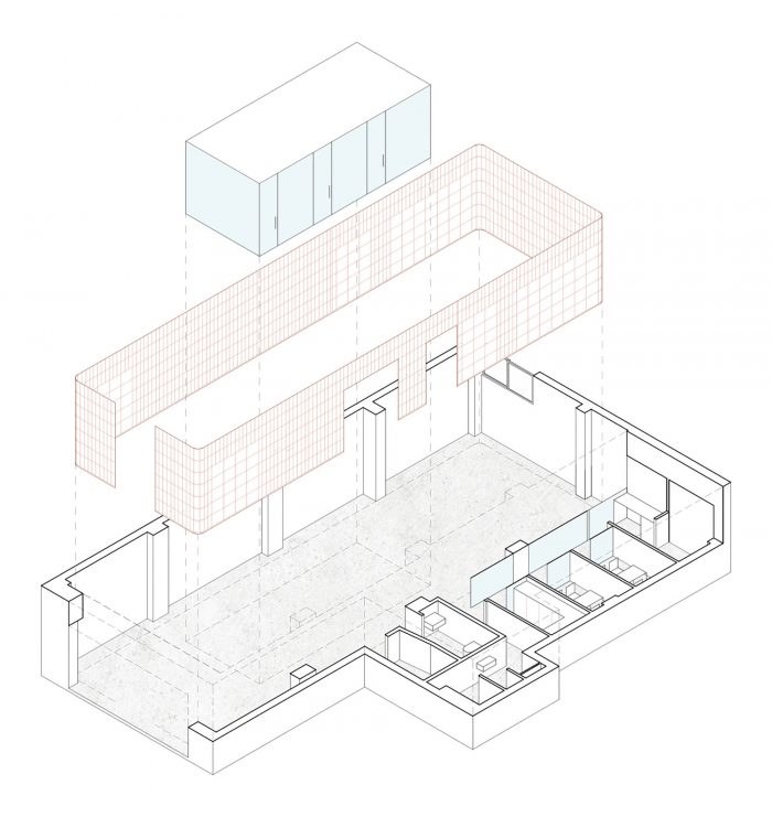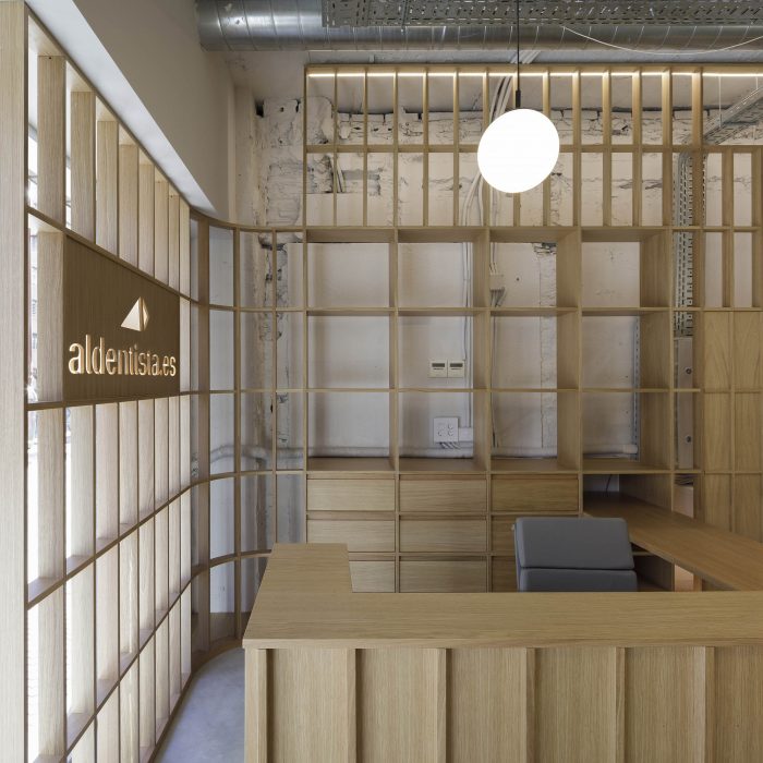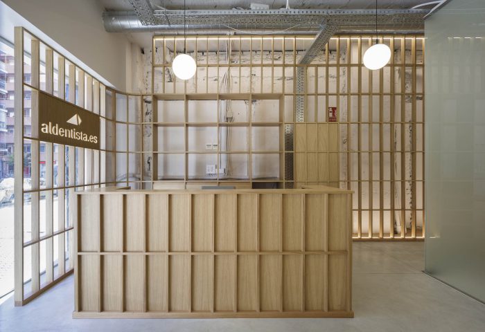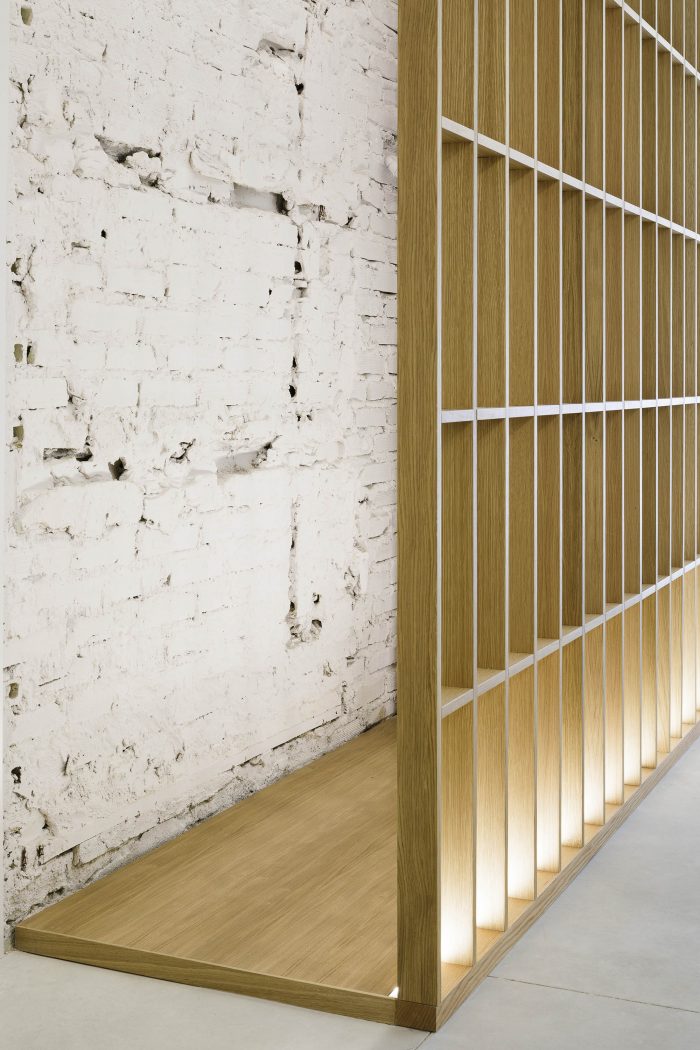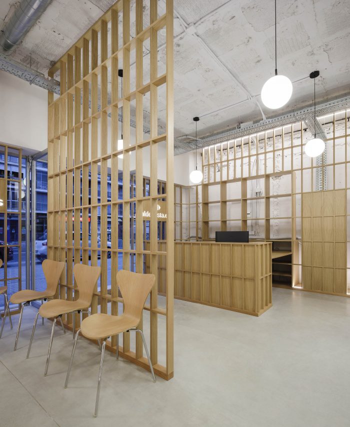The space only has access to natural light through its store front and a window on the back. With this in mind, the project leaves the entire shell uncovered, overlaying a series of translucent skins of various materials. These layers regulate the different levels of natural light and privacy that each room requires. On one hand, an oak wood lattice covers the entire perimeter of the space’s main bay. The lattice establishes a regular orthogonal grid, able to resolve all local programmatic requirements, such as thresholds, shelves, drawers, screens and reception desk. This regular element homogenizes the interior space of the clinic, while allowing for natural light and visual connections. It also partially shows the inconsistencies of the preexisting architectural frame.