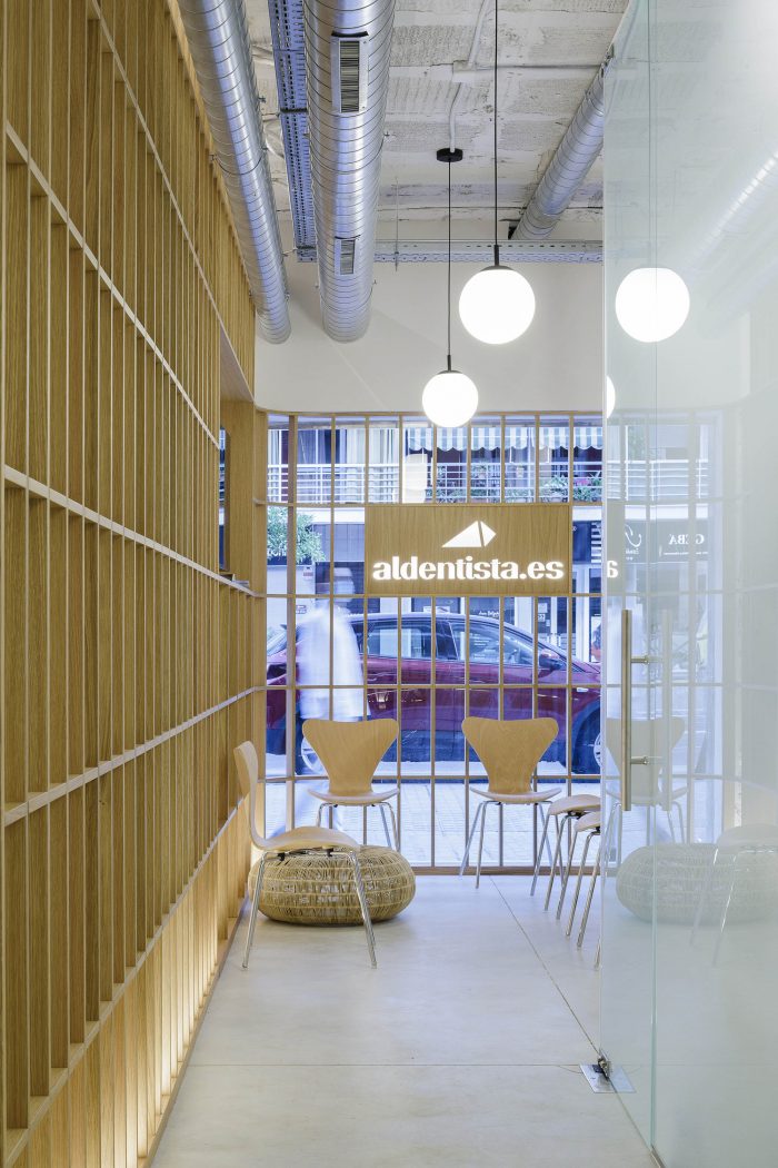 该空间只有通过其商店的正面和背面的一个窗户才能获得自然光。考虑到这一点,该项目让整个外壳不被覆盖,叠加了一系列不同材料的半透明表皮。这些层调节每个房间所需的不同程度的自然光和隐私。一方面,一个橡树木格子覆盖了空间主窗台的整个周边。格子建立了一个规则的正交网格,能够解决所有当地的程序性要求,如门槛、架子、抽屉、屏幕和接待台。这种规则的元素使诊所的内部空间均匀化,同时允许自然光和视觉连接。它也部分地显示了之前存在的建筑框架的不一致性。