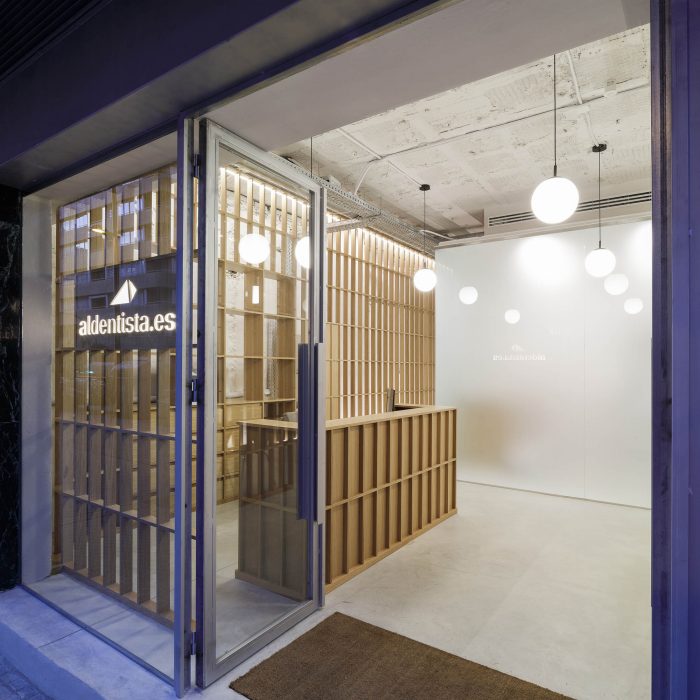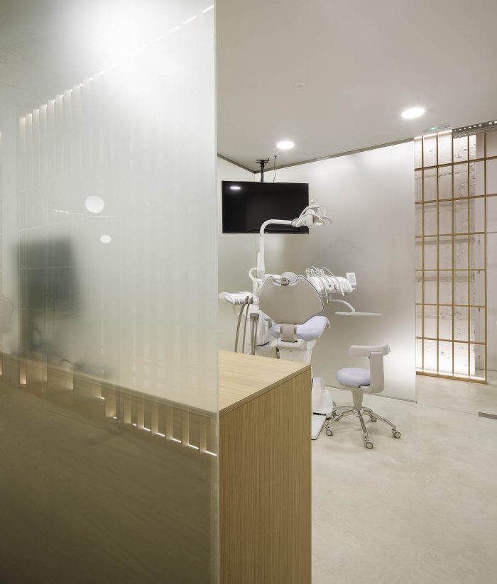 The clinic’s materiality is completed with a continuous polished concrete floor. The floor is pierced by a series of chambers and ducts that host all the technical systems that the dental equipment requires. The store front is composed by large pieces of clear glass, held by ad-hoc-designed galvanized steel framework.
