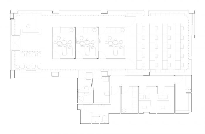 This project consists of the refurbishment of a retail space into a new dental clinic including three patient rooms and a classroom for 20 students. It focuses on the use of natural light and the optimization of circulation patterns in such a compact but diverse program.