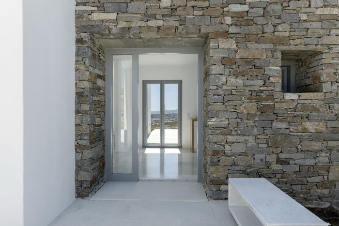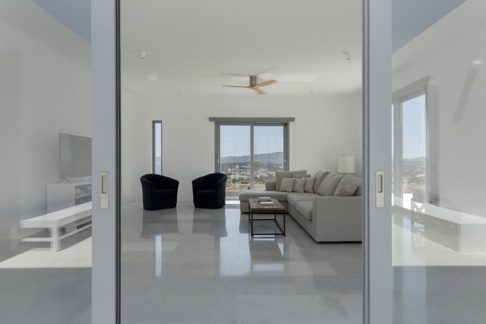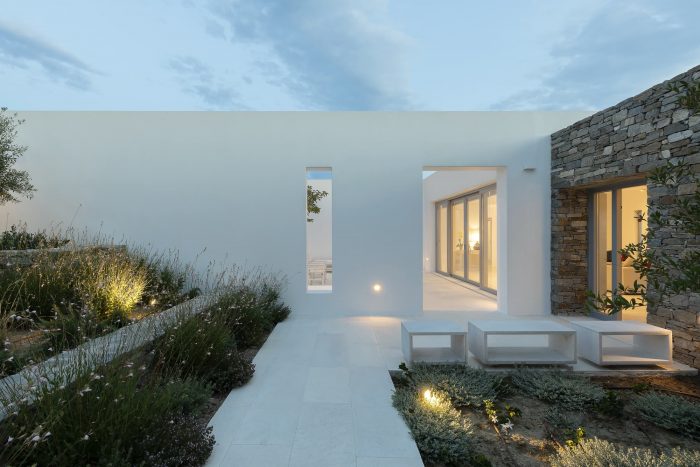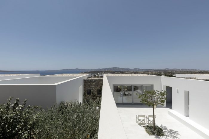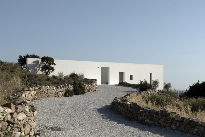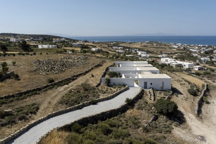 The plot is in the southern part of Paros Island. It has a southwest orientation on the long side, overlooking the sea, the bay of Aliki, and Antiparos. The building rests on the hillside and adapts to the topography and the terrain's morphology.