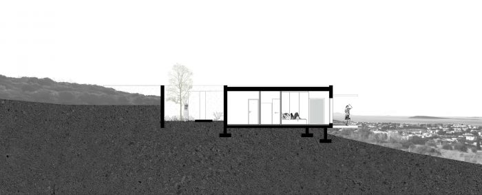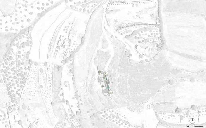 Large transverse walls penetrate the slope. These walls form the backyards and give continuity to the interior of the house towards the landscape. Spaces created between the walls, define the entrance, organize the garden, and give space for a water element and a sheltered courtyard.