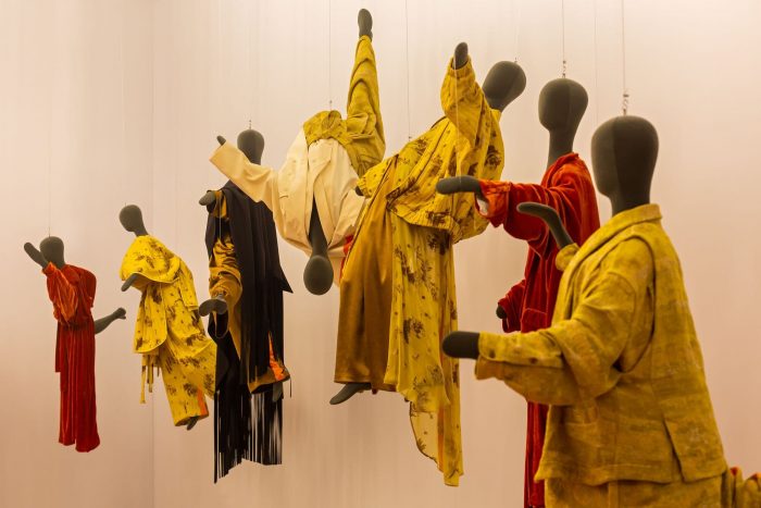 在第三个房间里,你终于可以看到有形的实物收藏,展示在不同形状和尺寸的人体模型上,这些模型用无形的线悬挂在天花板上。这些人体模型似乎漂浮在太空中,再现了在第一个房间看到的虚拟体验。