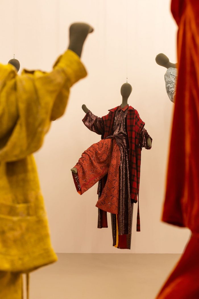 In the third room, you finally get to see the tangible and physical collection, displayed on mannequins of different shapes and sizes that are suspended from the ceiling with invisible threads. The mannequins appear to float in space, recreating the virtual experience seen in the first room.