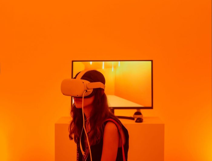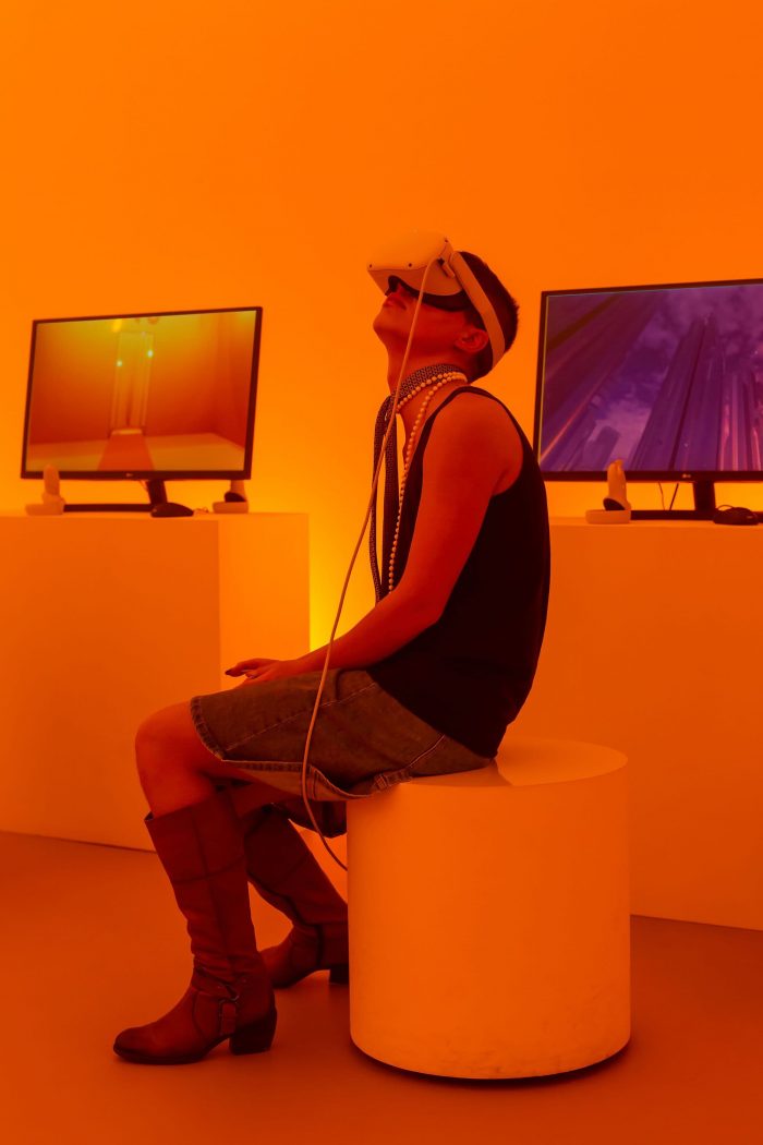 The second room is formed by a perimeter of LED displays that form a one big screen where the avatars of the previous experience are walking on a completely white neutral background, dressed in the new collection that is being showcased. In this space, the visitor blends in as if he or she was yet another avatar, walking across the orange carpet. This so-called carpet alludes to the fashion runway that extends across the entire linear route of the installation, connecting the three environments of the pavilion.