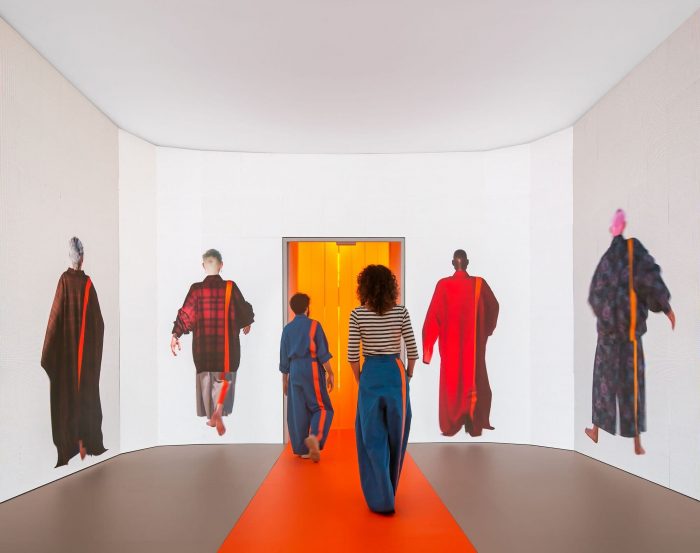 第二个房间由一圈LED显示屏组成,形成一个大屏幕,之前体验的化身在一个完全白色的中性背景上行走,身着正在展示的新系列。在这个空间里,参观者融入其中,仿佛他或她是另一个化身,走过橙色的地毯。这条所谓的地毯暗指延伸到整个装置的线性路线上的时尚跑道,连接着展馆的三个环境。