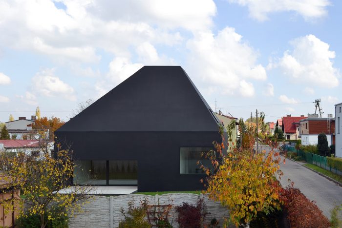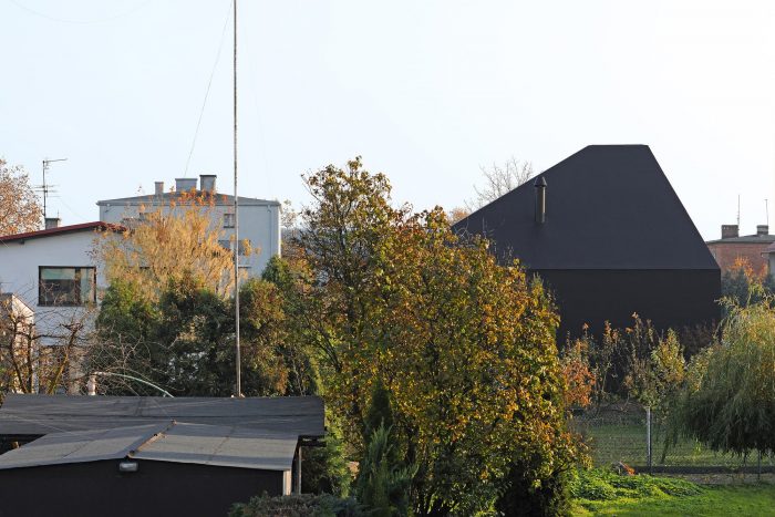 The homogenous appearance of the building has been achieved thanks to externally applied sprayed polyurethane layer. The technology, typically used in industrial construction, has been used in such a way in Poland for the first time. The proposed house consists of two ‘faces’: dark and inaccessible from the outside and bright and spacious from the inside. Contrast intended.