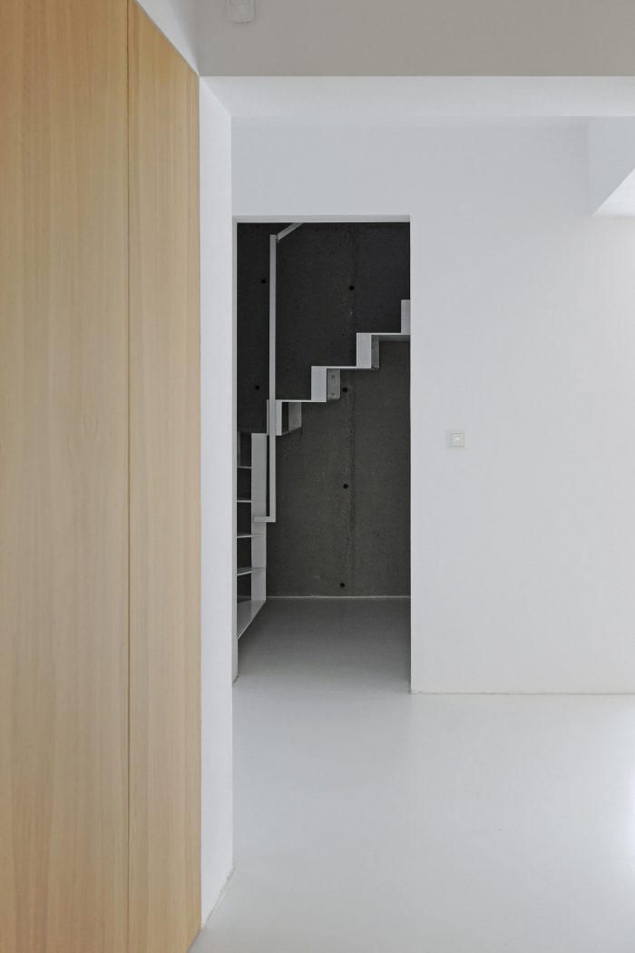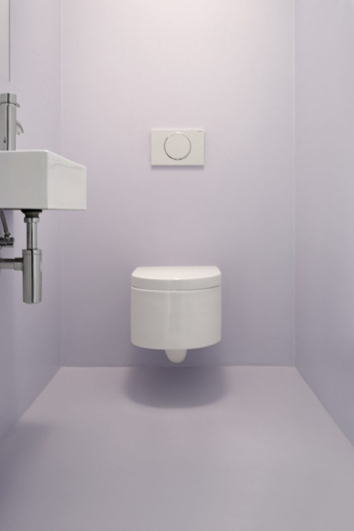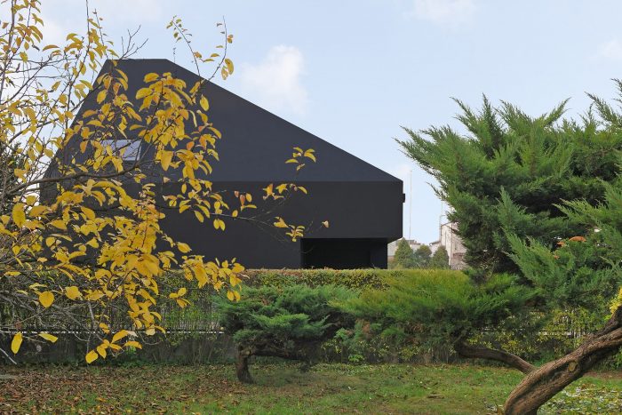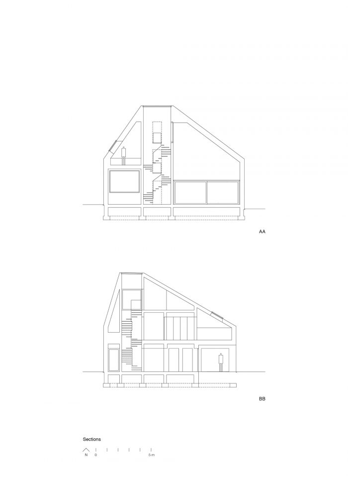 The form of the house varies from the buildings in close vicinity. The lack of decorative features or pastel colored elevations draw attention to the radical form and dark asphalt color. The building is a manifesto of both proportion over decorative features and urban planning over a building form.