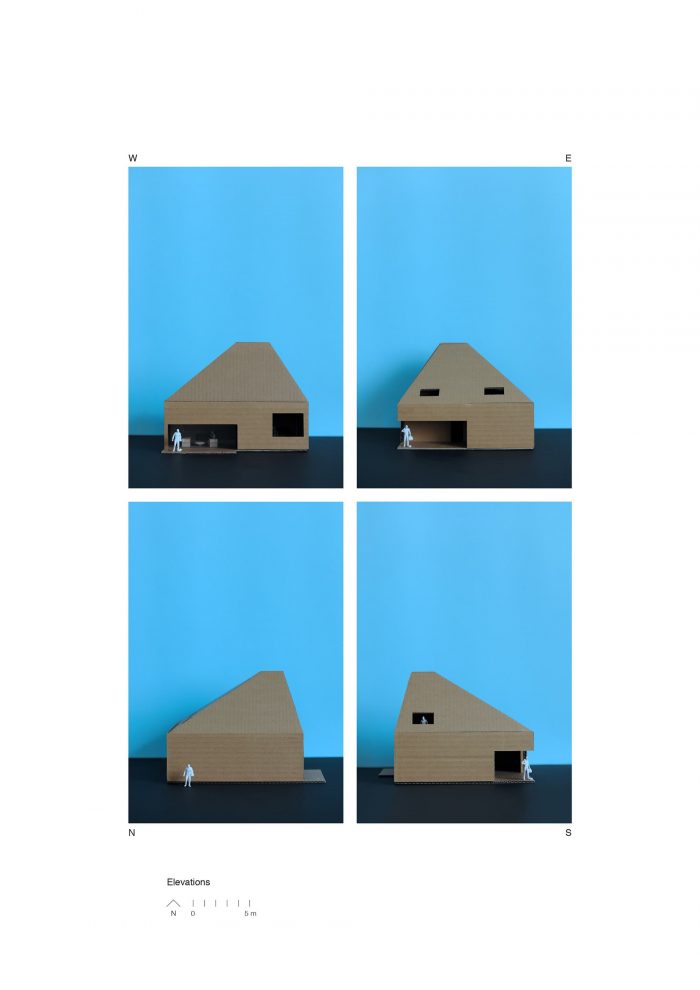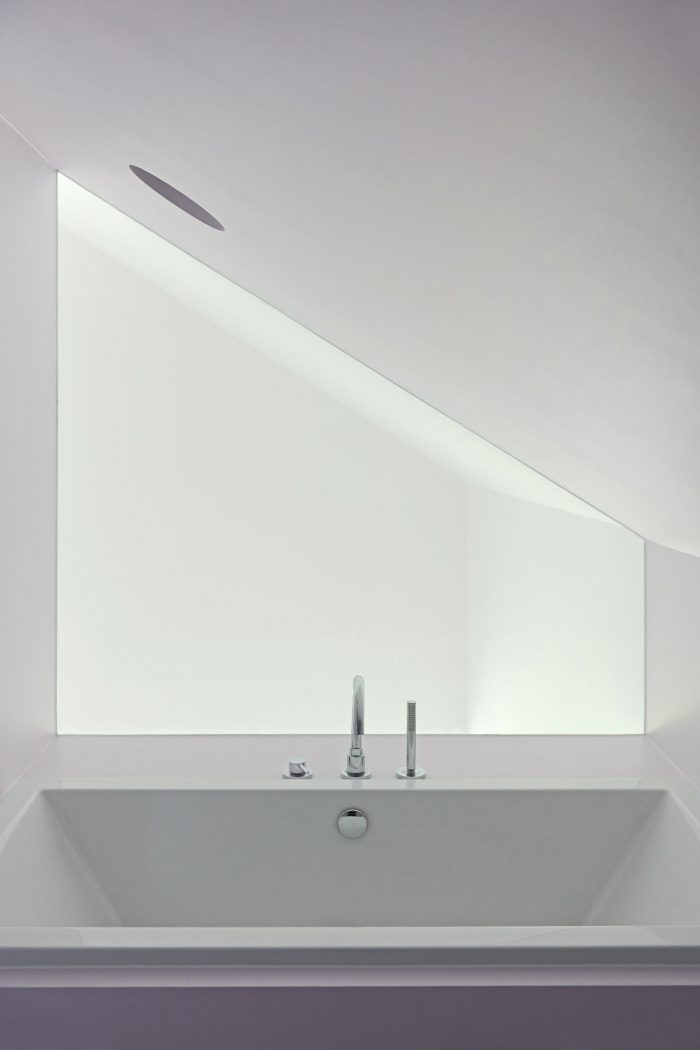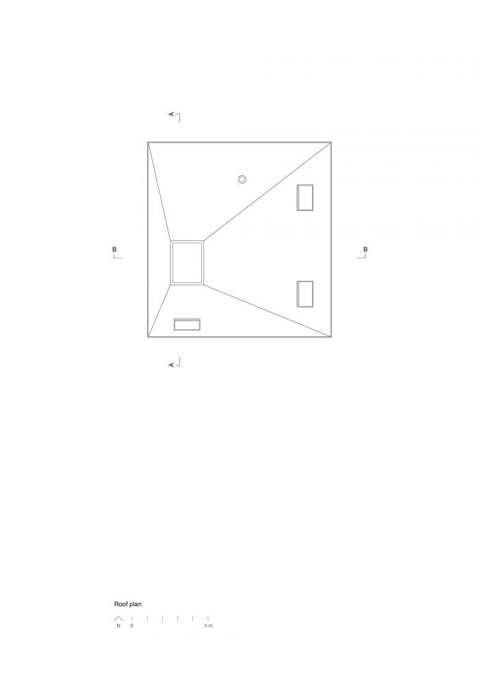 The compact and sustainable form of the proposed building encloses from the street and opens onto the west facing garden. The hipped form of the roof was dictated by the almost square dwelling house footprint. A simple pyramid roof underwent sculptural transformation. Firstly, the top of the roof was ’dragged’ towards the garden to achieve a visual set back from the adjacent property, then the roof was inclined towards the street to emphasize the existing building line, and finally the rooftop was ‘cut off’ to form a large (2.5m x 1.8m) skylight, enabling the daylight to penetrate deep down inside the house.