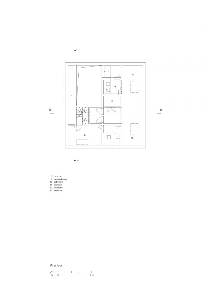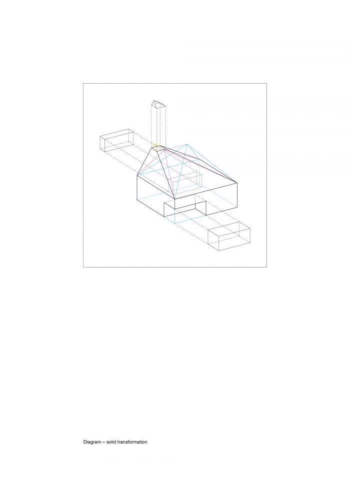 拟建建筑的紧凑和可持续的形式从街道上围起来,并向西面的花园开放。屋顶的倾斜形式是由几乎正方形的住宅占地面积决定的。一个简单的金字塔屋顶经历了雕塑般的转变。首先,屋顶的顶部被 "拖 "向花园,以实现与相邻房产的视觉间隔,然后屋顶被倾斜向街道,以强调现有的建筑线条,最后屋顶被 "切断",形成一个大的(2.5米×1.8米)天窗,使日光能够渗透到房屋内部深处。
