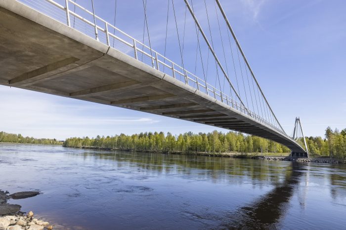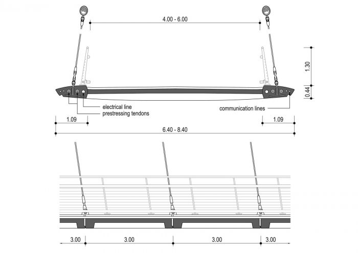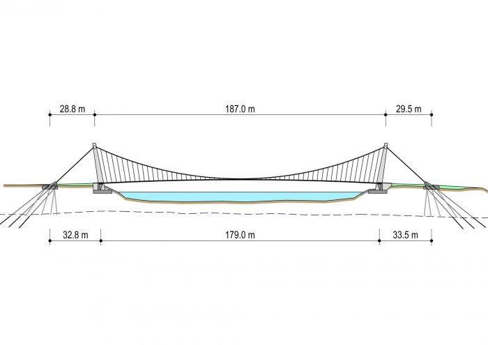 The streamlined cross-section of the bridge deck consists of only 400 mm deep edge beams and a 140 mm thick bridge deck slab. Each segment is reinforced by floor beams at the joints. Two suspension cables consist of 2x55 mono-strands grouted in steel pipes of 273 mm diameter. The deck is fix connected with suspension cables in the middle of the bridge.