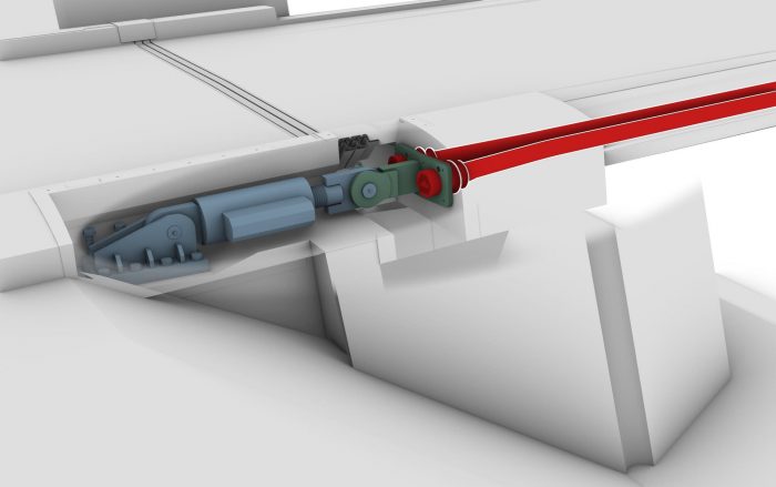 At the abutments the deck is supported by multi-directional bearings; the longitudinal guidance of expansion movements is ensured by guide bearings located in the bridge axis. To reduce the deck’s longitudinal movement due to the live load and dynamic component of the wind load, the deck is connected with the abutments by 2x2 shock-transition units. These units, together with the fixed connection of the suspension cables with the deck at the mid-span guarantee the bridge’s aerodynamic stability.