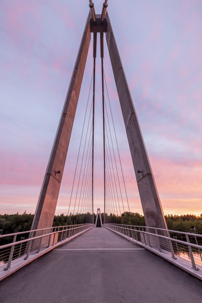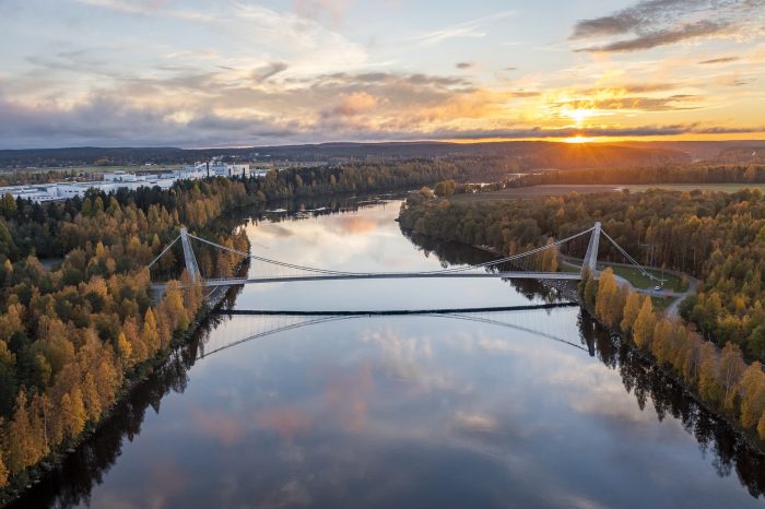 这座位于城市休闲区的人行天桥,连接着河的左岸和Bölesholmarna岛,并与一座连接河臂的小桥相连。人行桥连接着位于河两岸的行人和自行车道;它还承载着电力和通信电缆。