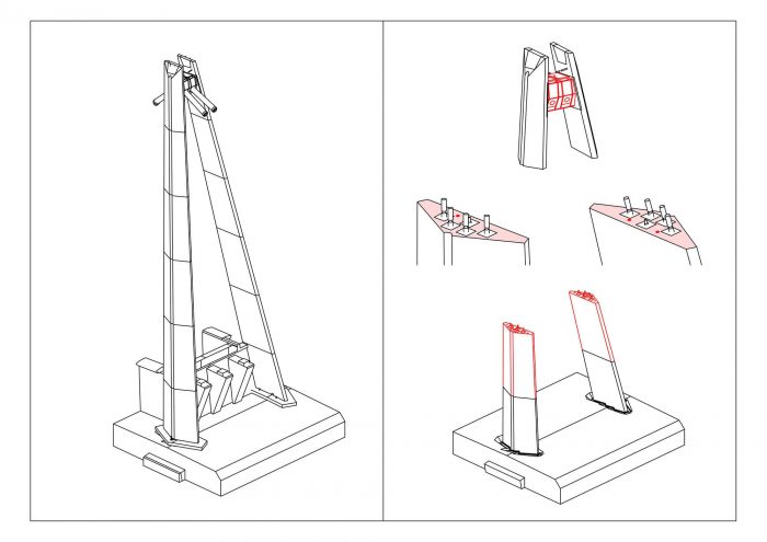30.25米高的铁塔呈字母A的形状。铁塔的腿是纵向和横向倾斜的,由预制的、匹配的混凝土段组装而成。在铁塔的顶部,电缆的锚箱被连接到腿上。缆绳的拉力被传递到锚定在基脚板上的末端钢锚块上。