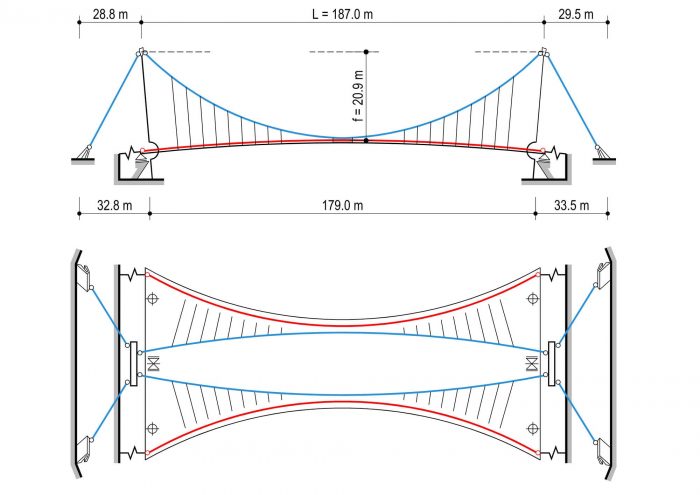 人行桥由一跨长度为179.00米的预应力混凝土桥面组成,它被悬挂在两根倾斜的悬索上,三跨长度分别为28.80+187.00+29.50米。桥面由59个三米长的预制混凝土段和两个整体的端部横梁组装而成,电缆的最大下垂为20.90米。
