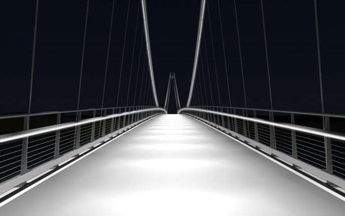 A simple railing, which is formed by a handrail supported by inclined posts, has rope filling. The walkway is lit by LED lights situated in the handrails.