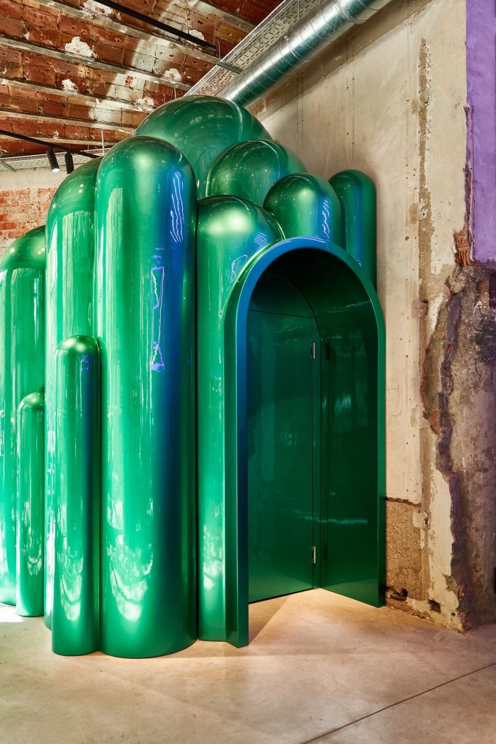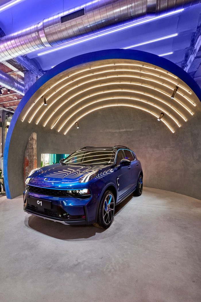 Just like that, immediately at the entrance, you can see a giant castle with a reflecting green color that contains the fitting rooms with a distorted effect that shows clearly that in the new Lynk & Co in Barcelona, nothing is traditional. The car from its sides is situated in a whale form made of 3D, while in the bathrooms you find a show of lights and sounds that will remind you of your favorite childhood movie.