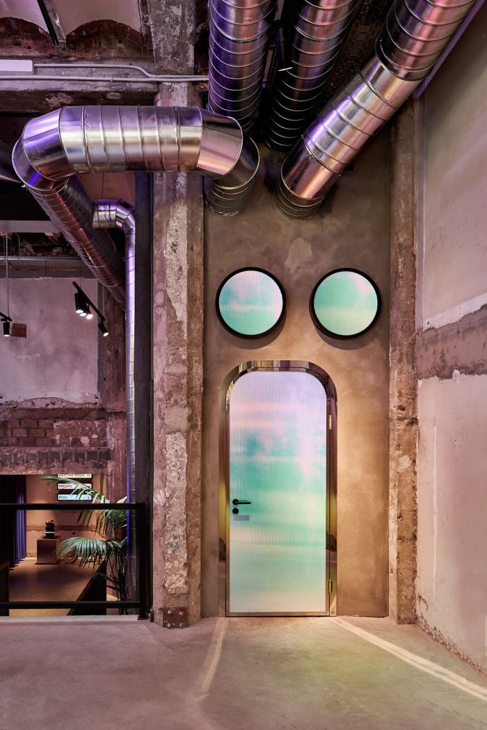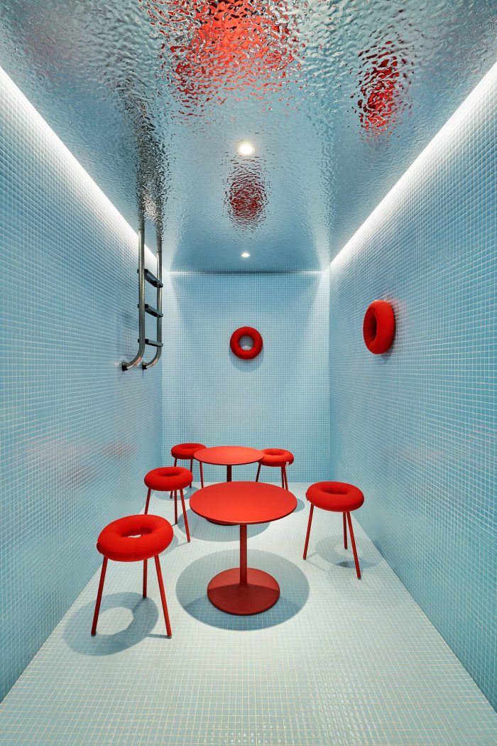 In the space above you can find exposition zones with sustainable objects, Lynk & Co selected, together with unexpected areas for co-working like the swimming pool that is behind an old safe door that was in the space before.